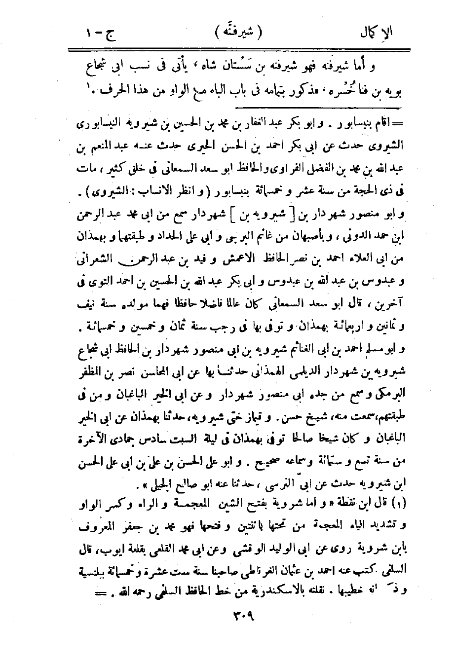1 قال ابن نقطة: "وأما شروية بفتح الشين المعجمة والراء وكسر الواو وتشديد الياء المعجمة من تحتها باثنتين وفتحها، فهو محمد بن جعفر المعروف بابن شروية روى عن أبي الوليد الوقشي وعن ابن محمد القلعي بقلعة أيوب، قال السلفي. كتب عنه أحمد بن عثمان الغرناطي صاحبنا سنة ست عشرة وخمسمائة ببلنسية وذكر أنه خطيبها. نقلته بالإسكندرية من خط الحافظ السلفي رحمه الله وأما سندويه بفتح السين المهملة وسكون النون وضم الدال المهملة وسكون الواو، فهو أحمد بن نصر بن سندويه البندار حدث عن يوسف بن موسى القطان حدث عنه عمر بن شاهين في معجم شيوخه".