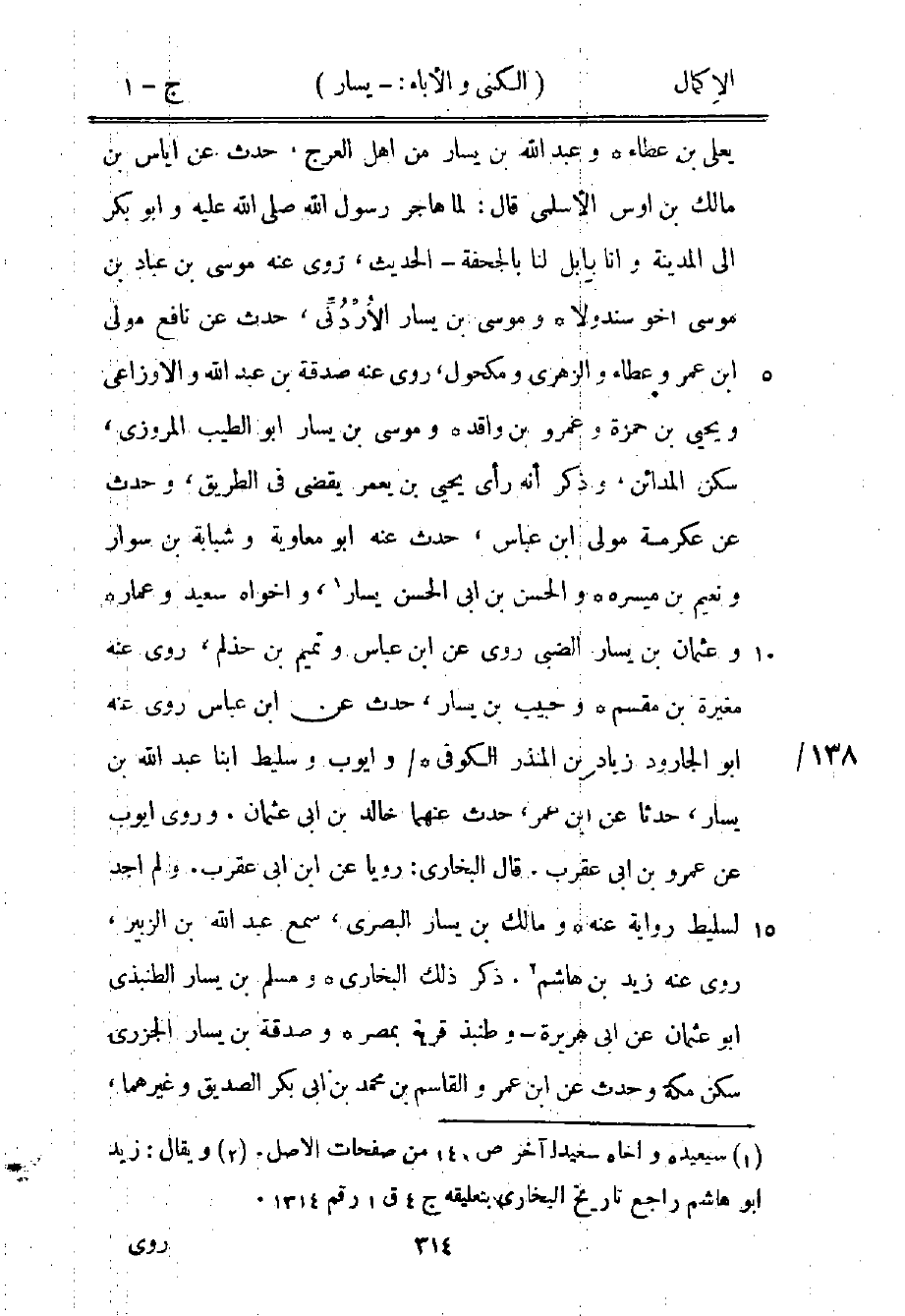 يعلى بن عطاء وعبد الله بن يسار من أهل العرج، حدث عن إياس بن مالك بن أوس السلمي قال: لما هاجر رسول الله صلى الله عليه وسلم وأبو بكر إلى المدينة وأنا بإبل لنا بالجحفة الحديث، روى عنه موسى بن عباد بن موسى أخو سندولا، وموسى بن يسار الأردني، حدث عن نافع مولى ابن عمر وعطاء والزهري ومكحول، روى عنه صدقة بن عبد الله والأوزاعي ويحيى بن حمزة وعمرو بن واقد، وموسى بن يسار أبو الطيب المروزي، سكن المدائن، وذكر أنه رأى يحيى بن يعمر يقضي في الطريق، وحدث عن عكرمة مولى ابن عباس، حدث عنه أبو معاوية وشبابة بن سوار ونعيم بن ميسره، والحسن بن أبي الحسن يسار1، وأخواه سعيد وعمار، وعثمان بن يسار الضبي روى عن ابن عباس وتميم بن حذلم، روى عنه مغيرة بن مقسم، وحبيب بن يسار، حدث عن ابن عباس روى عنه أبو الجارود زياد بن المنذر الكوفي، وأيوب وسليط ابنا عبد الله بن يسار، حدثا عن ابن عمر، حدث عنهما خالد بن أبي عثمان. وروى أيوب عن عمرو بن أبي عقرب. قال البخاري: رويا عن ابن أبي عقرب. ولم أجد لسليط رواية عنه، ومالك بن يسار البصري، سمع عبد الله بن الزبير، روى عنه زيد بن هاشم2. ذكر ذلك البخاري، ومسلم بن يسار الطنبذي أبو عثمان عن أبي هريرة وطنبذ قرية بمصر، وصدقة بن يسار الجزري سكن مكة وحدث عن ابن عمر والقاسم بن محمد بن أبي بكر الصديق وغيرهما،