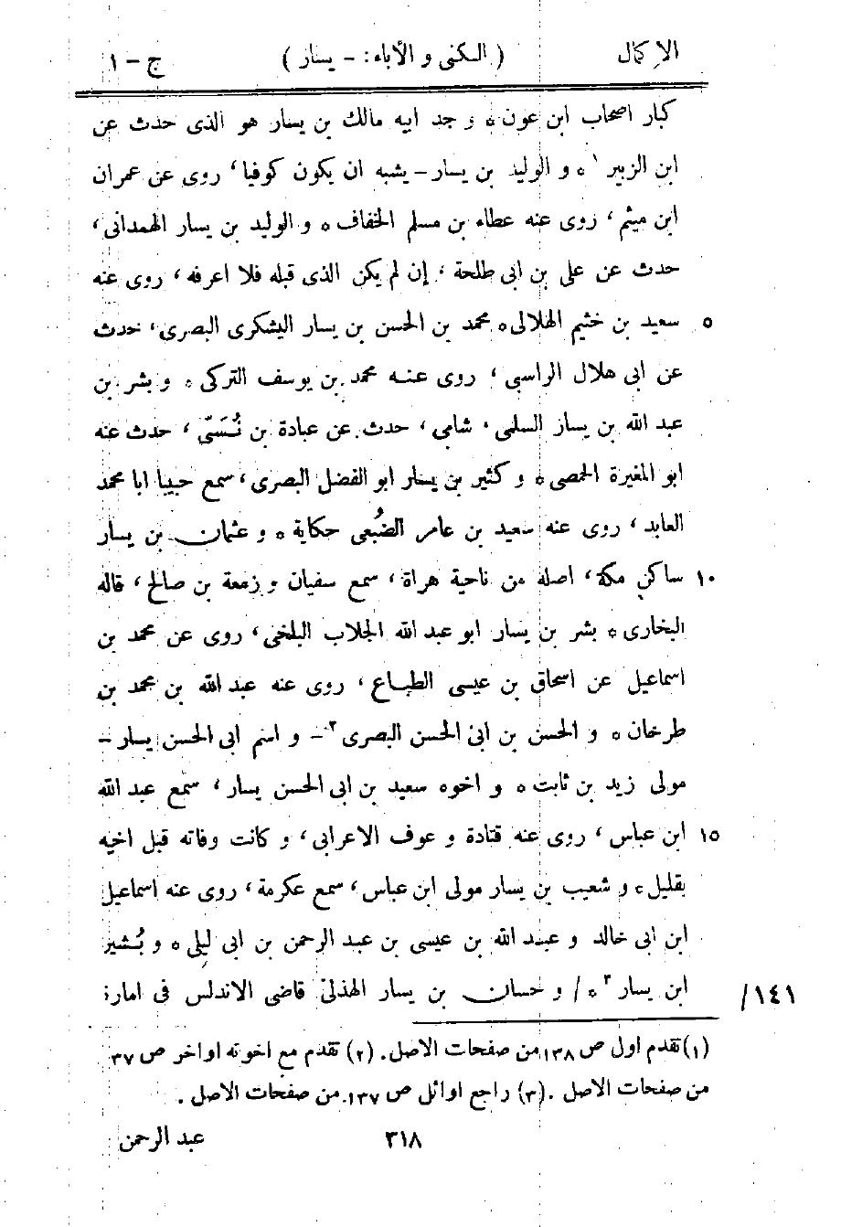 كبار أصحاب ابن عون وجد أبيه مالك بن يسار هو الذي حدث عن ابن الزبير1، والوليد بن يسار يشبه أن يكون كوفيًّا، روى عن عمران بن ميثم، روى عنه عطاء بن مسلم الخفاف، والوليد بن يسار الهمداني، حدث عن علي بن أبي طلحة، إن لم يكن الذي قبله فلا أعرفه، روى عنه سعيد بن خثيم الهلالي، محمد بن الحسن بن يسار اليشكري البصري، حدث عن أبي هلال الراسبي، روى عنه محمد بن يوسف التركي، وبشر بن عبد الله بن يسار السلمي، شامي، حدث عن عبادة بن نسي، حدث عنه أبو المغيرة الحمصي، وكثير بن يسار أبو الفضل البصري، سمع حبيبًا أبا محمد العابد، روى عنه سعيد بن عامر الضبعي حكاية، وعثمان بن يسار ساكن مكة، أصله من ناحية هراة، سمع سفيان وزمعة بن صالح، قاله البخاري، بشر بن يسار أبو عبد الله الجلاب البلخي، روى عن محمد بن إسماعيل عن إسحاق بن عيسى الطباع، روى عنه عبد الله بن محمد بن طرخان والحسن بن أبي الحسن البصري2 -واسم أبي الحسن يسار- مولى زيد بن ثابت، وأخوه سعيد بن أبي الحسن يسار، سمع عبد الله بن عباس، روى عنه قتادة وعوف الأعرابي، وكانت وفاته قبل أخيه بقليل، وشعيب بن يسار مولى ابن عباس، سمع عكرمة، روى عنه إسماعيل بن أبي خالد وعبد الله بن عيسى بن عبد الرحمن بن أبي ليلى، وبشير بن يسار3، وحسان بن يسار الهذلي قاضي الأندلس في إمارة