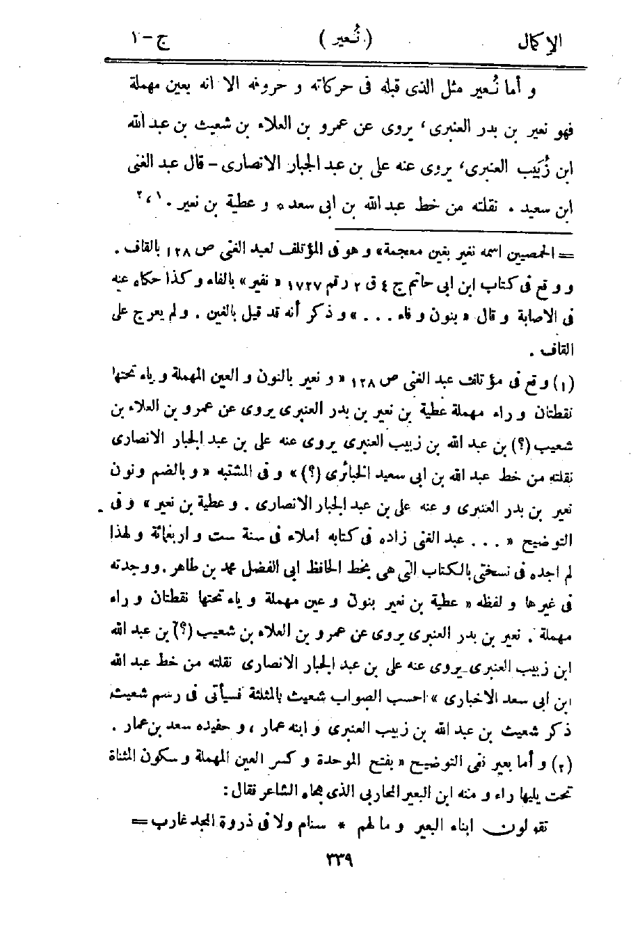 وأما نعير مثل الذي قبله في حركاته وحروفه إلا أنه بعين مهملة، فهو نعير بن بدر العنبري، يروي عن عمرو بن العلاء بن شعيث بن عبد الله بن زبيب العنبري، يروي عنه علي بن عبد الجبار الأنصاري، قال عبد الغني بن سعيد، نقلته من خط عبد الله بن أبي سعد وعطية بن نعير1، 2.