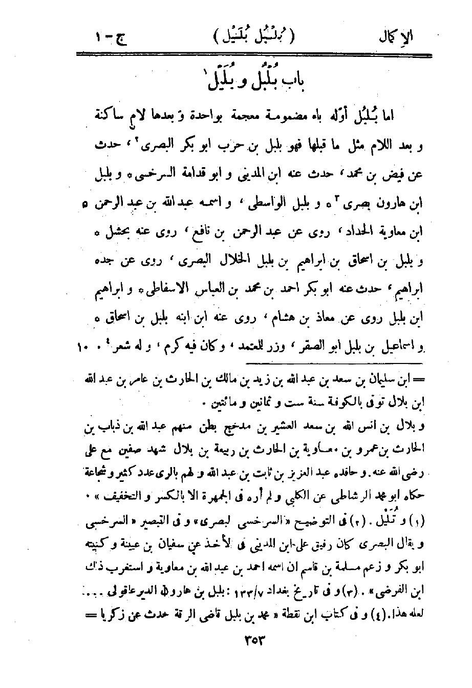أما بلبل أوله باء مضمومة معجمة بواحدة وبعدها لام ساكنة وبعد اللام مثل ما قبلها، فهو بلبل بن حرب أبو بكر البصري2، حدث عن فيض بن محمد، حدث عنه ابن المديني وأبو قدامة السرخسي، وبلبل بن هارون بصري3، وبلبل الواسطي، واسمه عبد الله بن عبد الرحمن بن معاوية الحداد، روى عن عبد الرحمن بن نافع، روى عنه بحشل، وبلبل بن إسحاق بن إبراهيم بن بلبل الخلال البصري، روى عن جده إبراهيم، حدث عنه أبو بكر أحمد بن محمد بن العباس الإسقاطي، وإبراهيم بن بلبل روى عن معاذ بن هشام، روى عنه ابن ابنه بلبل بن إسحاق، وإسماعيل بن بلبل أبو الصقر، وزر للمعتمد، وكان فيه كرم، وله شعر4.