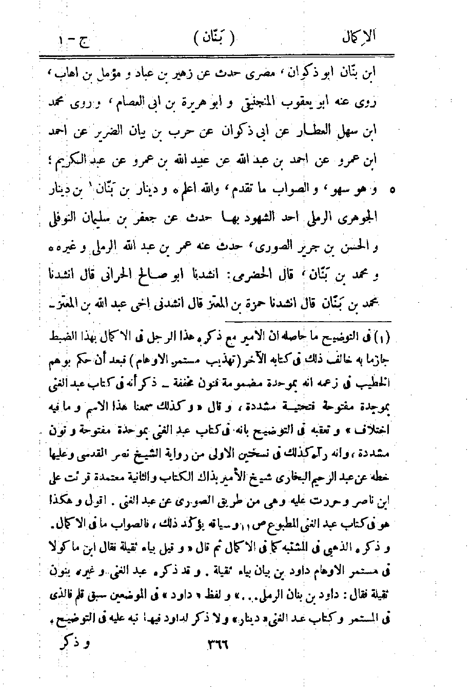 1 في التوضيح ما حاصله أن الأمير مع ذكره هذا الرجل في الإكمال بهذا الضبط جازما به خالف ذلك في كتابه الآخر "تهذيب مستمر الأوهام" فبعد أن حكم بوهم الخطيب في زعمه أنه بموحدة مضمومة فنون مخففة، ذكر أنه في كتاب عبد الغني بموحدة مفتوحة فتحتية مشددة، وقال: "وكذلك سمعنا هذا الاسم وما فيه اختلاف" وتعقبه في التوضيح بأنه في كتاب عبد الغني بموحدة مفتوحة ونون مشددة، وأنه رآه كذلك في نسختين الأولى من رواية الشيخ نصر المقدسي وعليها خطه عن عبد الرحيم البخاري شيخ الأمير بذاك الكتاب والثانية معتمدة قرئت على ابن ناصر وحررت عليه، وهي من طريق الصورى عن عبد الغني. أقول: وهكذا هو في كتاب عبد الغني المطبوع ص11 وسياقه يؤكد ذلك، فالصواب ما في الإكمال. وذكره الذهبي في المشتبه كما في الإكمال ثم قال: "وقيل: بياء ثقيلة فقال ابن ماكولا في مستمر الأوهام: داود بن بيان بياء ثقيلة. وقد ذكره عبد الغني وغيره بنون ثقيلة فقال: داود بن بنان الرملي ... " ولفظ "داود" في الموضعين سبق قلم فالذي في المستمر وكتاب عبد الغني "دينار" ولا ذكر لداود فيها نبه عليه في التوضيح،