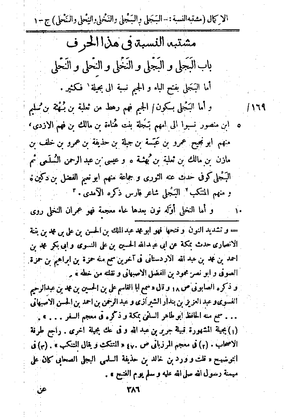 وأما البجلي بسكون الجيم، فهم رهط من ثعلبة بن بهثة بن سليم بن منصور نسبوا إلى أمهم بجلة بنت هناءة بن مالك بن فهم الأزدي، منهم أبو نجيح عمرو بن عبسة بن جبلة بن حذيفة بن عمرو بن خلف بن مازن بن مالك بن ثعلبة بن بهثة، وعيسى بن عبد الرحمن السلمي ثم البجلي كوفي حدث عنه الثوري وجماعة منهم أبو نعيم الفضل بن دكين ومنهم المتنكب2 البجلي شاعر فارس ذكره الآمدي3.