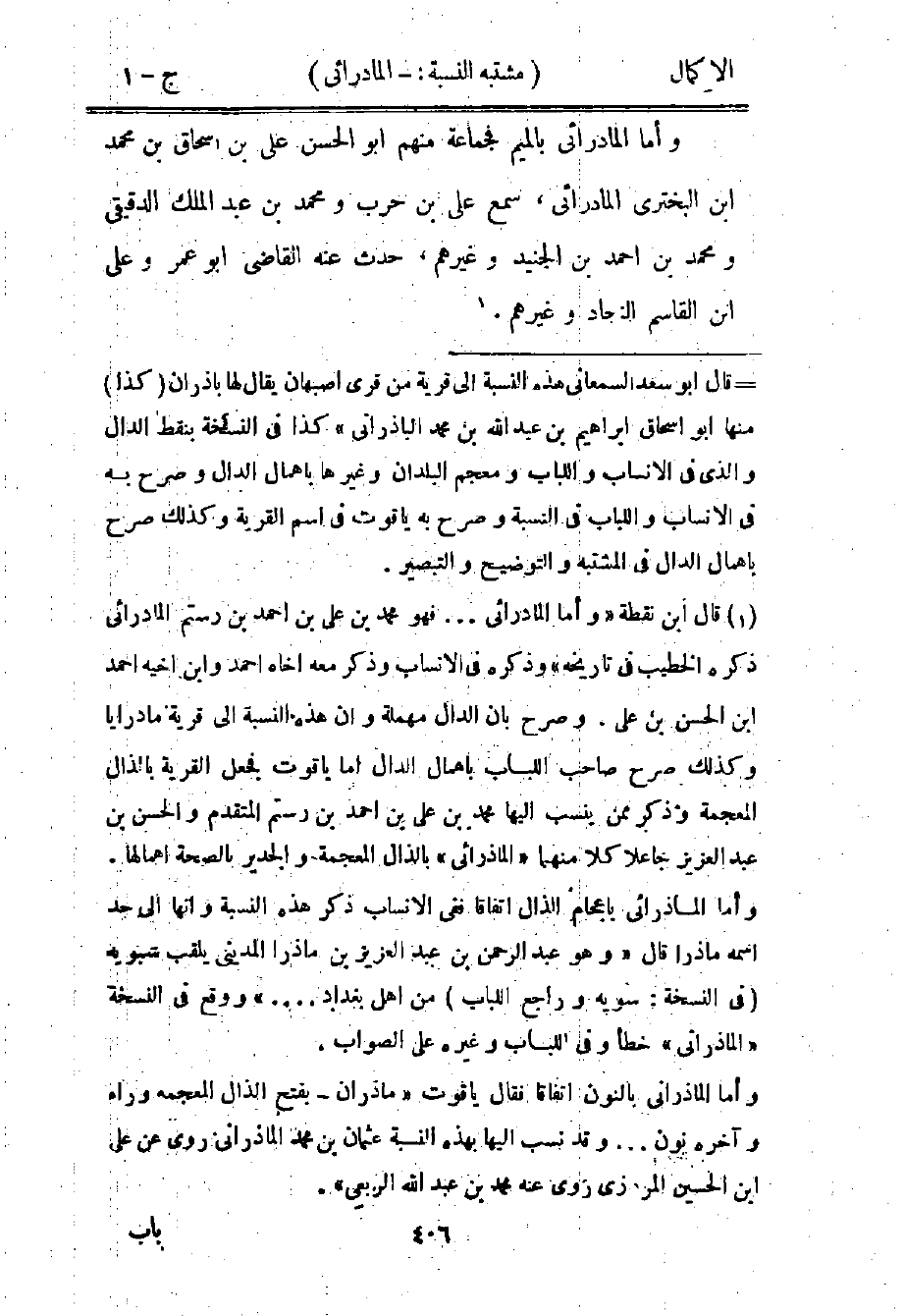 1 قال ابن نقطة: "وأما المادرائي ... فهو محمد بن علي بن أحمد بن رستم المادرائي ذكره الخطيب في تاريخه" وذكره في الأنساب وذكر معه أخاه أحمد وابن أخيه أحمد بن الحسن بن علي. وصرح بأن الدال مهملة وأن هذه النسبة إلى قرية مادرايا، وكذلك صرح صاحب اللباب بإهمال الدال، أما ياقوت فجعل القرية بالذال المعجمة وذكر ممن ينسب إليها محمد بن علي بن أحمد بن رستم المتقدم والحسن بن عبد العزيز جاعلا كلا منهما "الماذرائي" بالذال المعجمة والجدير بالصحة إهمالها. وأما الماذرائي بإعجام الذال اتفاقًا ففي الأنساب ذكر هذه النسبة وأنها إلى حد اسمه ماذرا قال: "وهو عبد الرحمن بن عبد العزيز بن ماذر المديني يلقب سيبويه "في النسخة: سويه وراجع اللباب" من أهل بغداد ... " ووقع في النسخة "الماذراني" خطأ وفي اللباب وغيره على الصواب.