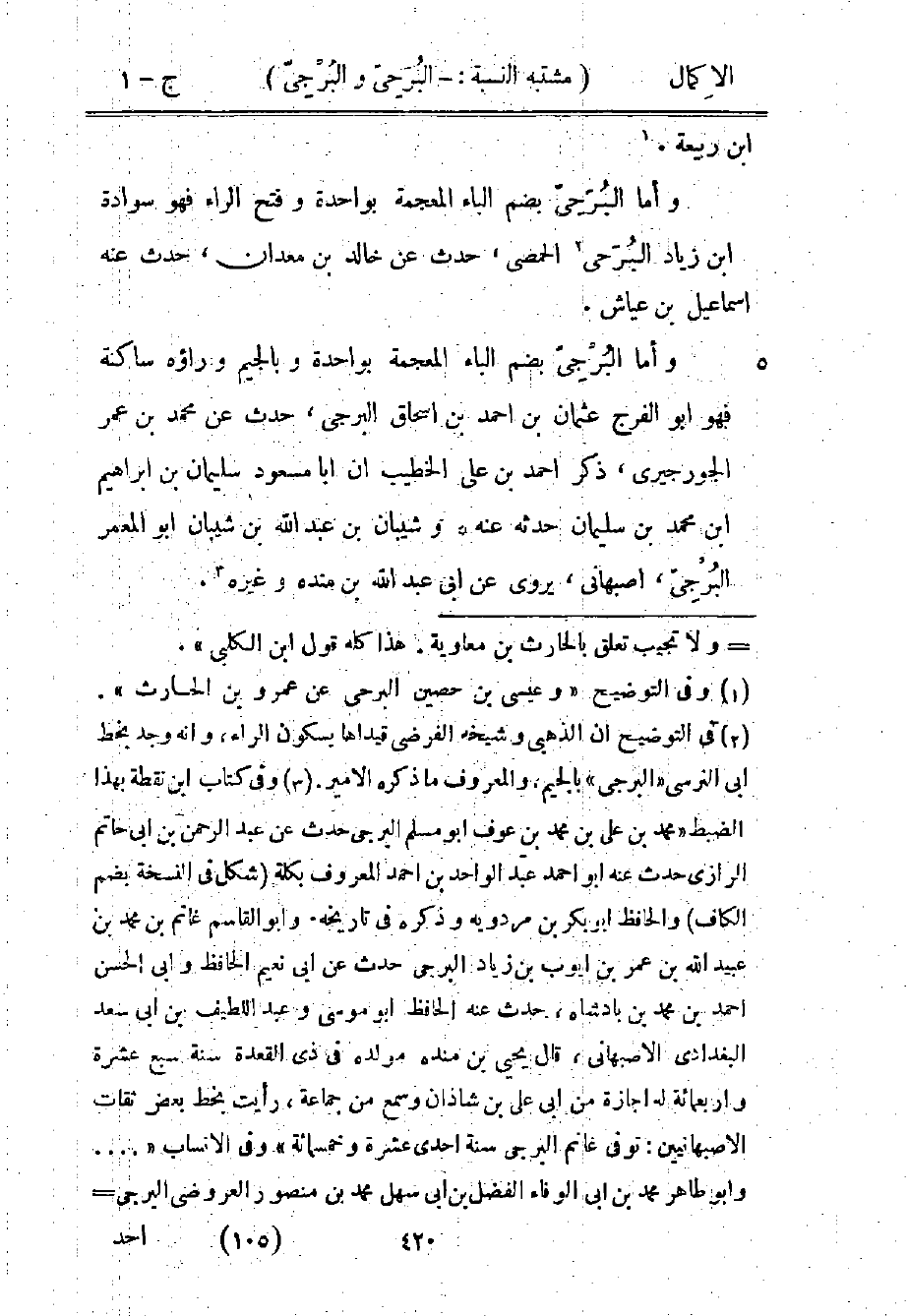 3 وفي كتاب ابن نقطة بهذا الضبط "محمد بن علي بن محمد بن عوف أبو مسلم البرجي حدث عن عبد الرحمن بن أبي حاتم الرازي حدث عنه أبو أحمد عبد الواحد بن أحمد المعروف بكلة "شكل في النسخة بضم الكاف" والحافظ أبو بكر بن مردويه وذكره في تاريخه. وأبو القاسم غانم بن محمد بن عبيد الله بن عمر بن أيوب بن زياد البرجي حدث عن أبي نعيم الحافظ وأبي الحسن أحمد بن محمد بن بادشاه، حدث عنه الحافظ أبو موسى وعبد اللطيف بن أبي سعد البغدادي الأصبهاني، قال يحيى بن منده: مولده في ذي القعدة سنة سبع عشرة وأربعمائة له إجازة من أبي علي بن شاذان وسمع من جماعة، رأيت بخط بعض ثقات الأصبهانيين: توفي غانم البرجي سنة إحدى عشرة وخمسمائة" وفي الأنساب " ... وأبو طاهر محمد بن أبي الوفاء الفضل بن أبي سهل محمد بن منصور العروض البرجي =