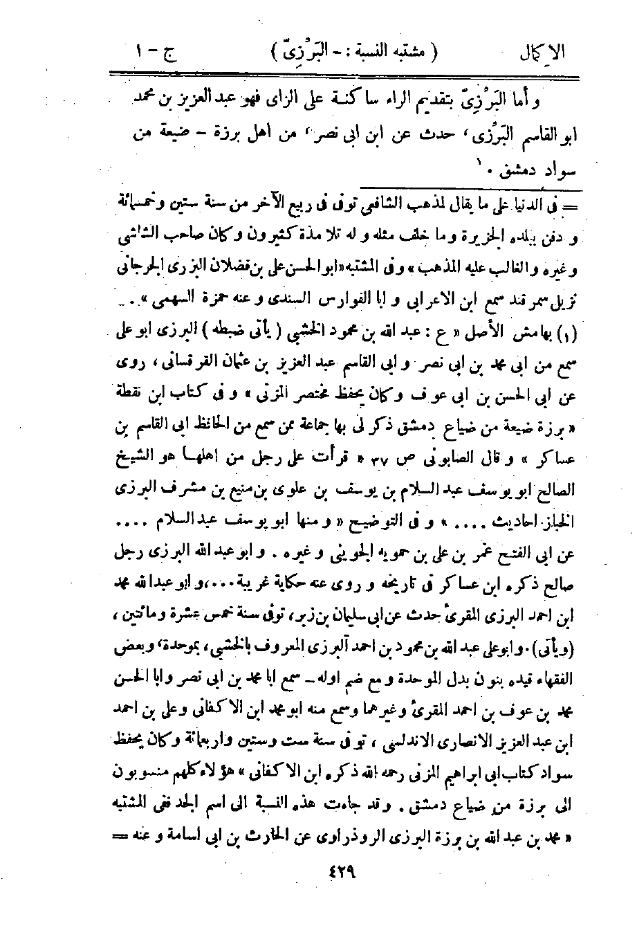 1 بهامش الأصل: "ع: عبد الله بن محمود الخشبي "يأتي ضبطه" البرزي أبو علي سمع من أبي محمد بن أبي نصر وأبي القاسم عبد العزيز بن عثمان القرقساني، روى عن أبي الحسن بن أبي عوف وكان يحفظ مختصر المزني" وفي كتاب ابن نقطة "برزة ضيعة من ضياع دمشق ذكر لي بها جماعة ممن سمع من الحافظ أبي القاسم بن عساكر" وقال الصابوني ص37: "قرأت على رجل من أهلها هو الشيخ الصالح أبو يوسف عبد السلام بن يوسف بن علوي بن منيع بن مشرف البرزي الخباز أحاديث ... " وفي التوضيح "ومنها أبو يوسف عبد السلام ... عن أبي الفتح غمر بن علي بن حمويه الجويني وغيره. وأبو عبد الله البرزى رجل صالح ذكره ابن عساكر في تاريخه وروى عنه حكاية غريبة ... ، وأبو عبد الله محمد بن أحمد البرزى المقرئ حدث عن أبي سليمان بن زبر، توفي سنة خمس عشرة ومائتين، "ويأتي". وأبو علي عبد الله بن محمود بن أحمد البرزى المعروف بالخشبي، بموحدة، وبعض الفقهاء قيده بنون بدل الموحدة ومع ضم أوله -سمع أبا محمد بن أبي نصر وأبا الحسن محمد بن عوف بن أحمد المقرئ وغيرهما وسمع منه أبو محمد بن الأكفاني وعلي بن أحمد بن عبد العزيز الأنصاري الأندلسي، توفي سنة ست وستين وأربعمائة وكان يحفظ سواد كتاب أبي إبراهيم المزني رحمه الله ذكره ابن الأكفاني" هؤلاء كلهم منسوبون إلى برزة من ضياع دمشق. وقد جاءت هذه النسبة إلى اسم الجد ففي المشتبه "محمد بن عبد الله بن برزة البرزي الروذراوي عن الحارث بن أبي أسامة وعنه ابن شبانة" قال في التوضيح: "ذكرته مع أخيه أحمد قبل في ترجمة "برزة" وابن شبانة هو أبو القاسم -وقيل: أبو سعيد- عبد الرحمن بن محمد بن شبانة المعدل".