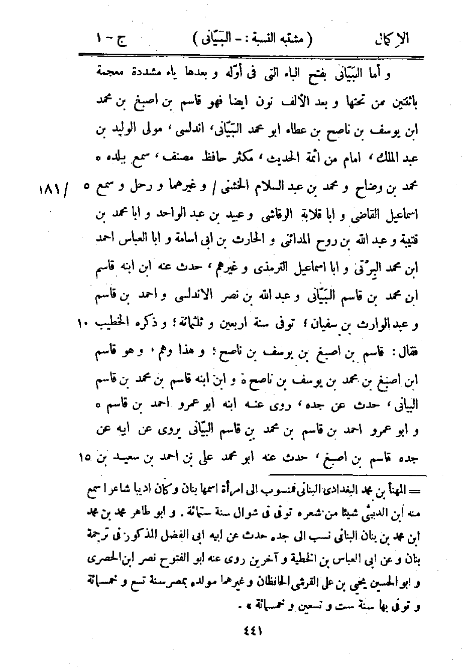 وأما البياني بفتح الباء التي في أوله وبعدها ياء مشددة معجمة باثنتين من تحتها وبعد الألف نون أيضًا، فهو قاسم بن أصبغ بن محمد بن يوسف بن ناصح بن عطاء أبو محمد البياني، أندلسي، مولى الوليد بن عبد الملك، إمام من أئمة الحديث، مكثر حافظ مصنف، سمع ببلده، محمد بن وضاح ومحمد بن عبد السلام الخشني وغيرهما ورحل وسمع إسماعيل القاضي وأبا قلابة الرقاشي وعبيد بن عبد الواحد وأبا محمد بن قتيبة وعبد الله بن روح المدائني والحارث بن أبي أسامة وأبا العباس أحمد بن محمد البرتي وأبا إسماعيل الترمذي وغيرهم، حدث عنه ابن ابنه قاسم بن محمد بن قاسم البياني وعبد الله بن نصر الأندلسي وأحمد بن قاسم وعبد الوارث بن سفيان؛ توفي سنة أربعين وثلاثمائة؛ وذكره الخطيب فقال: قاسم بن أصبغ بن يوسف بن ناصح؛ وهذا وهم، وهو قاسم بن أصبغ بن محمد بن يوسف بن ناصح، وابن ابنه قاسم بن محمد بن قاسم البياني، حدث عن جده، روى عنه ابنه أبو عمرو أحمد بن قاسم، وأبو عمرو أحمد بن قاسم بن محمد بن قاسم البياني يروي عن أبيه عن جده قاسم بن أصبغ، حدث عنه أبو محمد علي بن أحمد بن سعيد بن