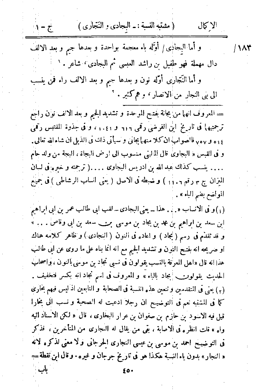 2 يعني في المتقدمين وتتعين هذه النسبة في الصحابة والتابعين إذ ليس فيهم بخاري كما في المشتبه نعم في التوضيح أن رجلا ادعيت له الصحبة ونسب إلى بخارى قيل فيه: الأسود بن حازم بن صفوان بن عرار البخاري، قال: "لكن الإسناد إليه واهٍ" قلت: انظره في الإصابة، بقي من يقال له النجاري من المتأخرين، فذكر في التوضيح أحمد بن موسى بن عيسى النجاري الجرجاني ولا معنى لذكره؛ لأنه "النجار" بدون ياء النسبة هكذا هو في تاريخ جرجان وغيره. وقال ابن نقطة: =