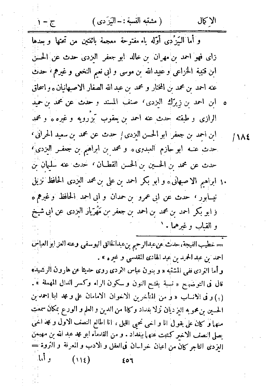 1 وفي الأنساب "ومن المتأخرين الأخوان الإمامان علي ومحمد ابنا أحمد بن الحسين بن محمويه اليزديان نزلا بغداد وكانا من الدين والعلم والورع بمكان سمعت منهما وكان علي يقول: أنا وأخي نحيي الليل، أنا أطالع النصف الأول ومحمد أخي يصلي النصف الأخير، كتبت عنهما بغداد. ومن القدماء أبو محمد عبد الله بن مهيمن اليزدي التاجر كان من أعيان خراسان في العقل والأدب والمعرفة والثروة =