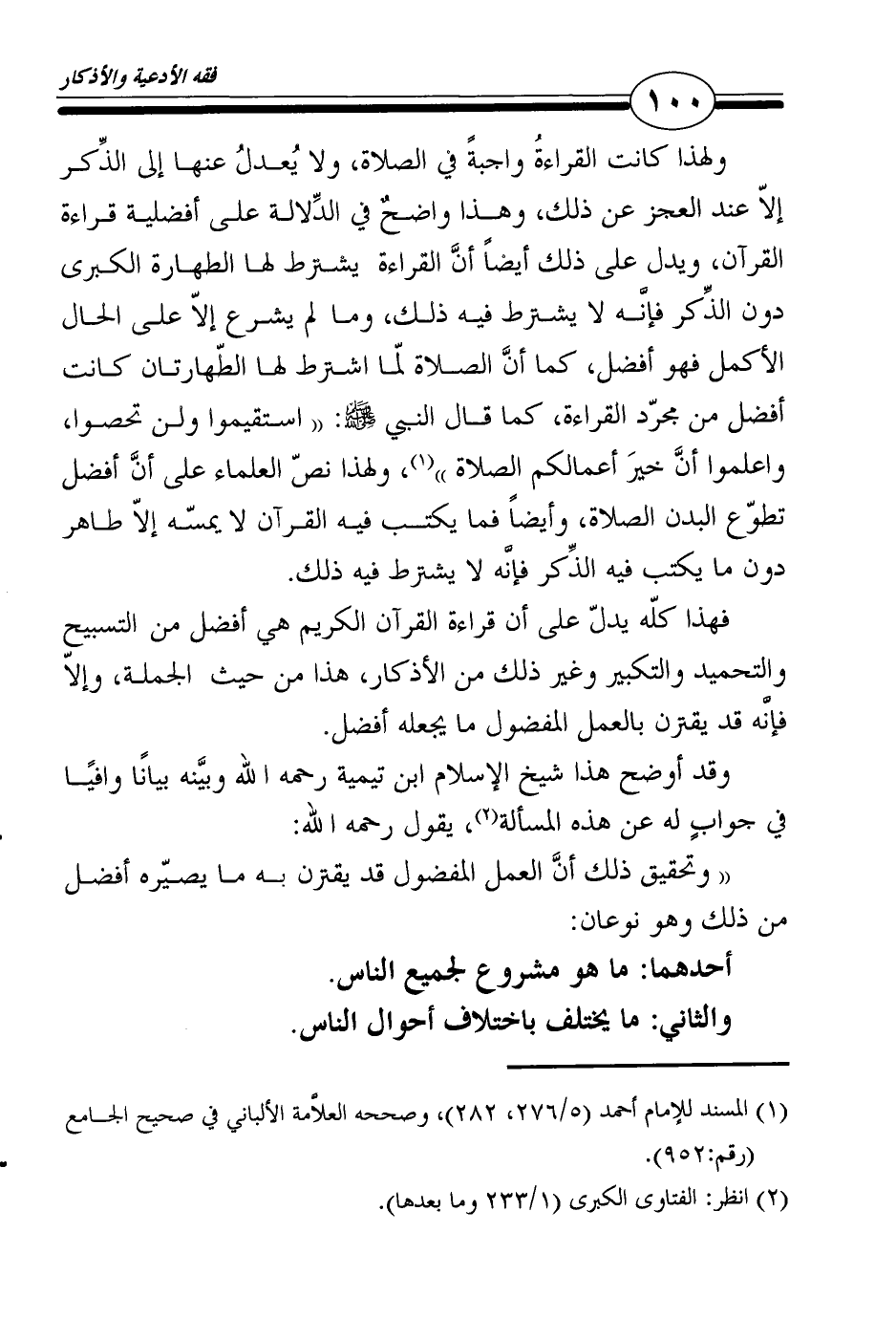 ولهذا كانت القراءةُ واجبةً في الصلاة، ولا يُعدلُ عنها إلى الذِّكر إلاّ عند العجز عن ذلك، وهذا واضحٌ في الدِّلالة على أفضلية قراءة القرآن، ويدل على ذلك أيضاً أنَّ القراءة يشترط لها الطهارة الكبرى دون الذِّكر فإنَّه لا يشترط فيه ذلك، وما لم يشرع إلاّ على الحال الأكمل فهو أفضل، كما أنَّ الصلاة لمّا اشترط لها الطّهارتان كانت أفضل من مجرّد القراءة، كما قال النبي صلى الله عليه وسلم: "استقيموا ولن تحصوا، واعلموا أنَّ خيرَ أعمالكم الصلاة"1، ولهذا نصّ العلماء على أنَّ أفضل تطوّع البدن الصلاة، وأيضاً فما يكتب فيه القرآن لا يمسّه إلاّ طاهر دون ما يكتب فيه الذِّكر فإنَّه لا يشترط فيه ذلك.