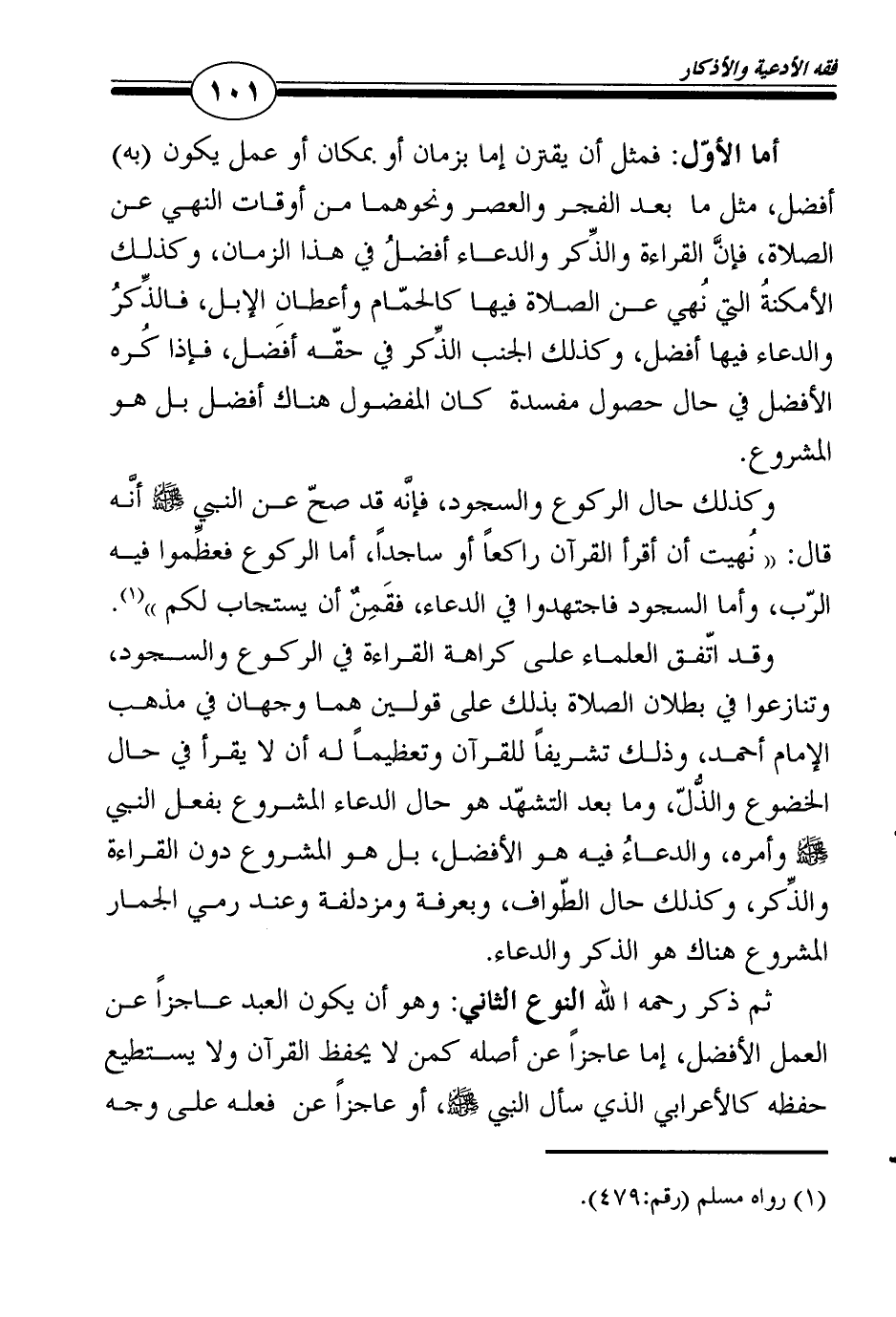 أما الأوّل: فمثل أن يقترن إما بزمان أو بمكان أو عمل يكون (به) أفضل، مثل ما بعد الفجر والعصر ونحوهما من أوقات النهي عن الصلاة، فإنَّ القراءة والذِّكر والدعاء أفضلُ في هذا الزمان، وكذلك الأمكنةُ التي نُهي عن الصلاة فيها كالحمّام وأعطانِ الإبل، فالذِّكرُ والدعاء فيها أفضل، وكذلك الجنب الذِّكر في حقّه أفضل، فإذا كُره الأفضل في حال حصول مفسدة كان المفضول هناك أفضل بل هو المشروع.