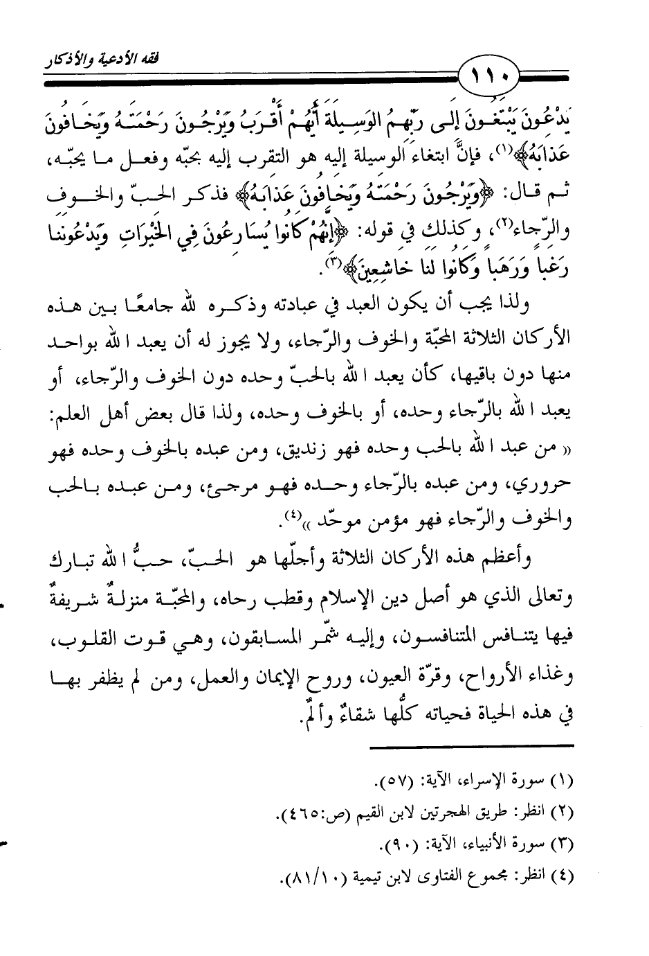يَدْعُونَ يَبْتَغُونَ إِلَى رَبِّهِمُ الوَسِيلَةَ أَيُّهُمْ أَقْرَبُ وَيَرْجُونَ رَحْمَتَهُ وَيَخَافُونَ عَذَابَهُ} 1، فإنَّ ابتغاء الوسيلة إليه هو التقرب إليه بحبّه وفعل ما يحبّه، ثم قال: {وَيَرْجُونَ رَحْمَتَهُ وَيَخَافُونَ عَذَابَهُ} فذكر الحبّ والخوف والرّجاء2، وكذلك في قوله: {إِنَّهُمْ كَانُوا يُسَارِعُونَ فِي الخَيْرَاتِ وَيَدْعُونَنَا رَغَباً وَرَهَباً وَكَانُوا لَنَا خَاشِعِينَ} 3.