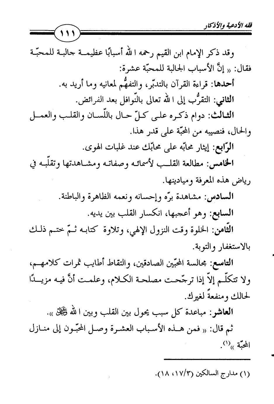 وقد ذكر الإمام ابن القيم رحمه الله أسبابًا عظيمة جالبة للمحبّة فقال: "إنَّ الأسباب الجالبة للمحبّة عشرة: