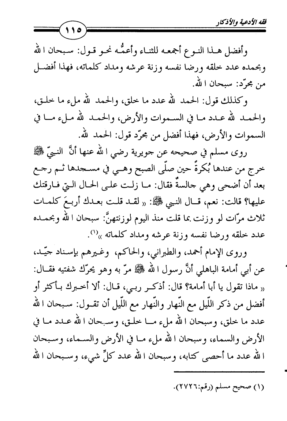 وروى الإمام أحمد، والطبراني، والحاكم، وغيرهم بإسناد جيّد، عن أبي أمامة الباهلي أنَّ رسول الله صلى الله عليه وسلم مرّ به وهو يحرّك شفتيه فقال: "ماذا تقول يا أبا أمامة؟ قال: أذكر ربي، قال: ألا أخبرك بأكثر أو أفضل من ذكر اللّيل مع النّهار والنّهار مع اللّيل أن تقول: سبحان الله عدد ما خلق، وسبحان الله ملء ما خلق، وسبحان الله عدد ما في الأرض والسماء، وسبحان الله ملء ما في الأرض والسماء، وسبحان الله عدد ما أحصى كتابه، وسبحان الله