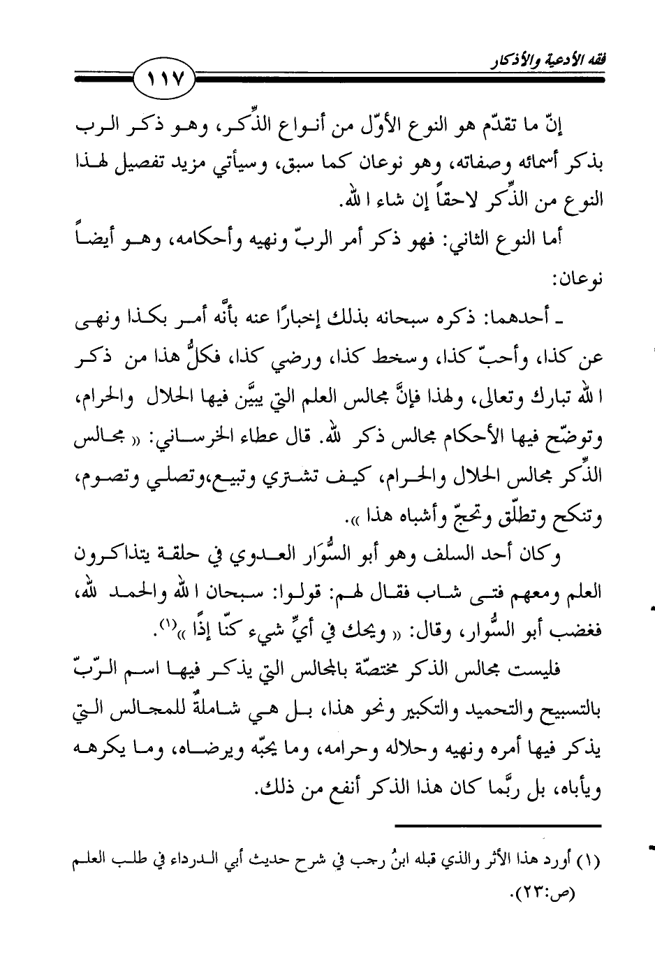 ـ أحدهما: ذكره سبحانه بذلك إخبارًا عنه بأنَّه أمر بكذا ونهى عن كذا، وأحبّ كذا، وسخط كذا، ورضي كذا، فكلُّ هذا من ذكر الله تبارك وتعالى، ولهذا فإنَّ مجالس العلم التي يبيَّن فيها الحلال والحرام، وتوضّح فيها الأحكام مجالس ذكر لله. قال عطاء الخرساني: "مجالس الذِّكر مجالس الحلال والحرام، كيف تشتري وتبيع، وتصلي وتصوم، وتنكح وتطلّق وتحجّ وأشباه هذا".