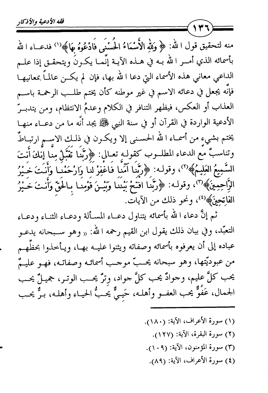 منه لتحقيق قول الله: {وَللهِ الأَسْمَاءُ الحُسْنَى فَادْعُوهُ بِهَا} 1 فدعاء الله بأسمائه الذي أمر الله به في هذه الآية إنَّما يكون ويتحقق إذا علم الداعي معاني هذه الأسماء التي دعا الله بها، فإن لم يكن عالماً بمعانيها فإنَّه يجعل في دعائه الاسم في غير موطنه كأن يختم طلب الرحمة باسم العذاب أو العكس، فيظهر التنافر في الكلام وعدمُ الانتظام، ومن يتدبرّ الأدعية الواردة في القرآن أو في سنة النبي صلى الله عليه وسلم يجد أنَّه ما من دعاء منها يختم بشيءٍ من أسماء الله الحسنى إلا ويكون في ذلك الاسم ارتباطٌ وتناسبٌ مع الدعاء المطلوب كقوله تعالى: {رَبَّنَا تَقَبَّلْ مِنَّا إِنَّكَ أَنتَ السَّمِيعُ العَلِيمُ} 2، وقوله: {رَبَّنَا آمَنَّا فَاغْفِرْ لَنَا وَارْحَمْنَا وَأَنتَ خَيْرُ الرَّاحِمِينَ} 3، وقوله: {رَبَّنَا افْتَحْ بَيْنَنَا وَبَيْنَ قَوْمِنَا بِالحَقِّ وَأَنتَ خَيْرُ الفَاتِحِينَ} 4، ونحو ذلك من الآيات.