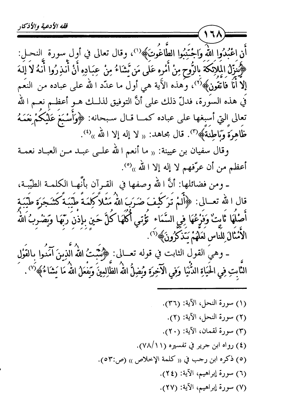 أَنِ اعْبُدُوا اللهَ وَاجْتَنِبُوا الطَّاغُوتَ} 1، وقال تعالى في أول سورة النحل: {يُنَزِّلُ المَلاَئِكَةَ بِالرُّوحِ مِنْ أَمْرِهِ عَلَى مَن يَّشَاءُ مِنْ عِبَادِهِ أَنْ أَنْذِرُوا أَنَّهُ لاَ إِلَهَ إِلاَّ أَنَا فَاتَّقُونِ} 2، وهذه الآية هي أول ما عدّد الله على عباده من النعم في هذه السورة، فدلّ ذلك على أنَّ التوفيق لذلك هو أعظم نعم الله تعالى التي أسبغها على عباده كما قال سبحانه: {وَأَسْبَغَ عَلَيْكُمْ نِعَمَهُ ظَاهِرَةً وَبَاطِنَةً} 3. قال مجاهد: "لا إله إلا الله"4.