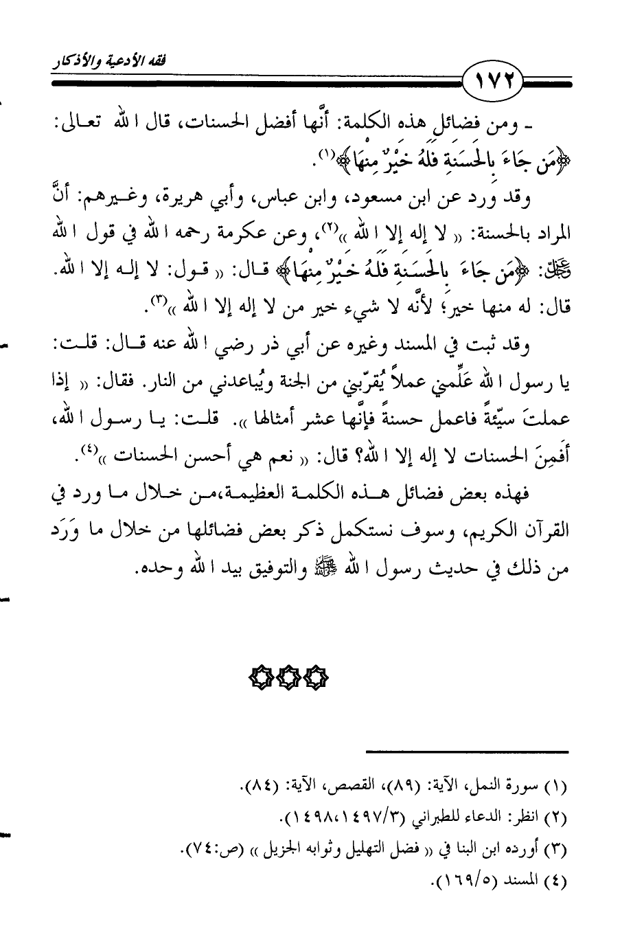 ـ ومن فضائل هذه الكلمة: أنَّها أفضل الحسنات، قال الله تعالى: {مَن جَاءَ بِالحَسَنَةِ فَلَهُ خَيْرٌ مِنْهَا} 1.