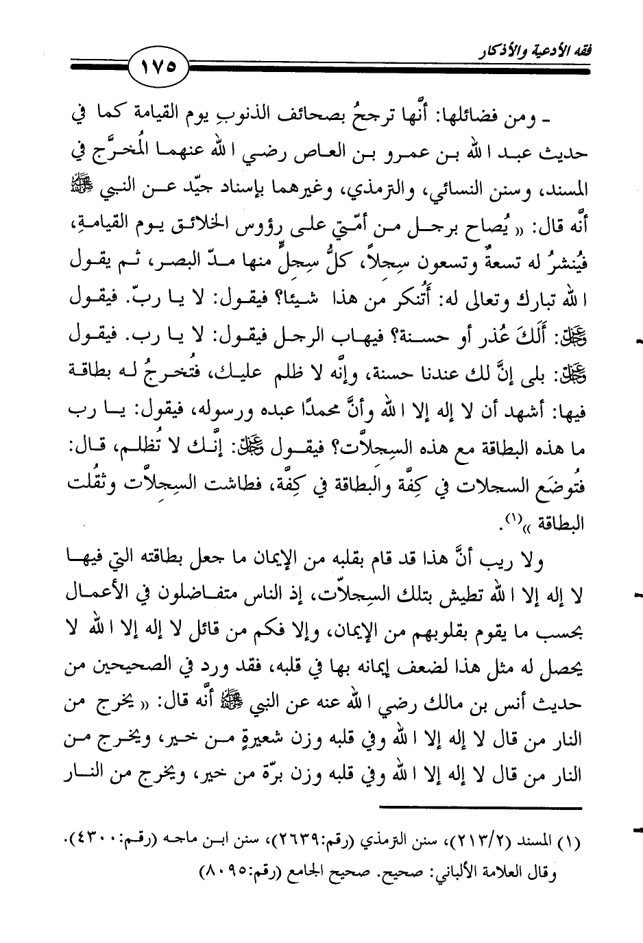 ولا ريب أنَّ هذا قد قام بقلبه من الإيمان ما جعل بطاقته التي فيها لا إله إلا الله تطيش بتلك السِجلاّت، إذ الناس متفاضلون في الأعمال بحسب ما يقوم بقلوبهم من الإيمان، وإلا فكم من قائل لا إله إلا الله لا يحصل له مثل هذا لضعف إيمانه بها في قلبه، فقد ورد في الصحيحين من حديث أنس بن مالك رضي الله عنه عن النبي صلى الله عليه وسلم أنَّه قال: "يخرج من النار من قال لا إله إلا الله وفي قلبه وزن شعيرةٍ من خير، ويخرج من النار من قال لا إله إلا الله وفي قلبه وزن برّة من خير، ويخرج من النار