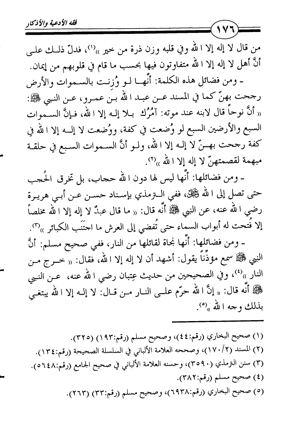 ـ ومن فضائل هذه الكلمة: أنَّها لو وُزِنت بالسموات والأرض رجحت بهنّ كما في المسند عن عبد الله بن عمرو، عن النبي صلى الله عليه وسلم: " أنَّ نوحاً قال لابنه عند موته: آمُرُك بلا إله إلا الله، فإنَّ السموات السبع والأرضين السبع لو وُضعت في كفة، ووُضعت لا إله إلا الله في كفة رجحت بهنّ لا إله إلا الله، ولو أنَّ السموات السبع في حلقة مبهمة لقصمتهنّ لا إله إلا الله"2.