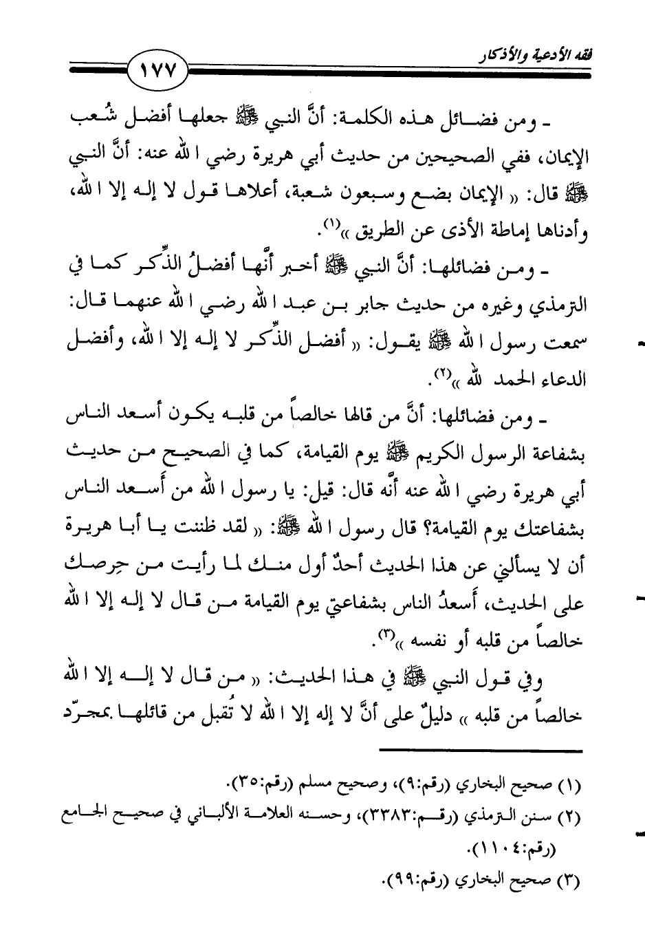 ـ ومن فضائل هذه الكلمة: أنَّ النبي صلى الله عليه وسلم جعلها أفضل شُعب الإيمان، ففي الصحيحين من حديث أبي هريرة رضي الله عنه: أنَّ النبي صلى الله عليه وسلم قال: "الإيمان بضع وسبعون شعبة، أعلاها قول لا إله إلا الله، وأدناها إماطة الأذى عن الطريق"1.
