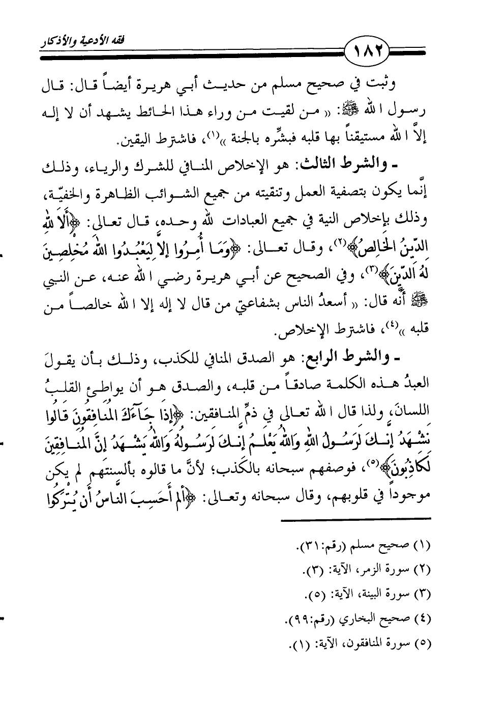 ـ والشرط الثالث: هو الإخلاص المنافي للشرك والرياء، وذلك إنَّما يكون بتصفية العمل وتنقيته من جميع الشوائب الظاهرة والخفيّة، وذلك بإخلاص النية في جميع العبادات لله وحده، قال تعالى: {أَلاَ للهِ الدِّينُ الخَالِصُ} 2، وقال تعالى: {وَمَا أُمِرُوا إلاَّ لِيَعْبُدُوا اللهَ مُخْلِصِينَ لَهُ الدِّينَ} 3، وفي الصحيح عن أبي هريرة رضي الله عنه، عن النبي صلى الله عليه وسلم أنَّه قال: "أسعدُ الناس بشفاعتي من قال لا إله إلا الله خالصاً من قلبه"4، فاشترط الإخلاص.