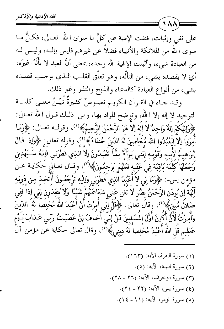 وقد جاء في القرآن الكريم نصوصٌ كثيرةٌ تُبيّنُ معنى كلمة التوحيد لا إله إلا الله، وتوضح المراد بها، ومن ذلك قول الله تعالى: {وَإِلَهُكُمْ إِلَهٌ وَاحِدٌ لاَ إِلَهَ إِلاَّ هُوَ الرَّحْمَنُ الرَّحِيمُ} 1، وقوله تعالى: {وَمَا أُمِرُوا إِلاَّ لِيَعْبُدُوا اللهَ مُخْلِصِينَ لَهُ الدِّينَ حُنَفَاءَ} 2، وقوله تعالى: {وَإِذْ قَالَ إِبْرَاهِيمُ لأَبِيهِ وَقَوْمِهِ إِنَّنِي بَرَآءٌ مِمَّا تَعْبُدُونَ إِلاَّ الَّذِي فَطَرَنِي فَإِنَّهُ سَيَهْدِينِ وَجَعَلَهَا كَلِمَةً بَاقِيَةً فِي عَقِبِهِ لَعَلَّهُمْ يَرْجِعُونَ} 3، وقال تعالى حكاية عن مؤمن يس~: {وَمَا لِي لاَ أَعْبُدُ الَّذِي فَطَرَنِي وَإِلَيْهِ تُرْجَعُونَ أَأَتَّخِذُ مِن دُونِهِ آلِهَةً إِن يُرِدْنِ الرَّحْمَنُ بِضُرٍّ لاَ تُغْنِ عَنِّي شَفَاعَتُهُمْ شَيْئاً وَلاَ يُنقِذُونِ إِنِّي إِذاً لَفِي ضَلاَلٍ مُبِينٍ} 4، وقال تعالى: {قُلْ إِنِّي أُمِرْتُ أَنْ أَعْبُدَ اللهَ مُخْلِصاً لَهُ الدِّينَ وَأُمِرْتُ لأَنْ أَكُونَ أَوَّلَ المُسْلِمِينَ قُلْ إِنِّي أَخَافُ إِنْ عَصَيْتُ رَبِّي عَذَابَ يَوْمٍ عَظِيمٍ قُلِ اللهَ أَعْبُدُ مُخْلِصاً لَهُ دِينِي} 5، وقال تعالى حكاية عن مؤمن آل