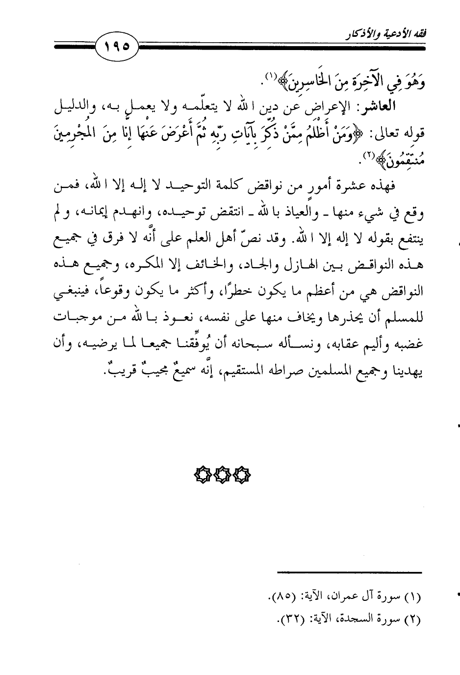 فهذه عشرة أمورٍ من نواقض كلمة التوحيد لا إله إلا الله، فمن وقع في شيء منها ـ والعياذ بالله ـ انتقض توحيده، وانهدم إيمانه، ولم ينتفع بقوله لا إله إلا الله. وقد نصّ أهل العلم على أنَّه لا فرق في جميع هذه النواقض بين الهازل والجاد، والخائف إلا المكره، وجميع هذه النواقض هي من أعظم ما يكون خطرًا، وأكثر ما يكون وقوعاً، فينبغي للمسلم أن يحذرها ويخاف منها على نفسه، نعوذ بالله من موجبات غضبه وأليم عقابه، ونسأله سبحانه أن يُوفِّقنا جميعا لما يرضيه، وأن يهدينا وجميع المسلمين صراطه المستقيم، إنَّه سميعٌ مجيبٌ قريبٌ.