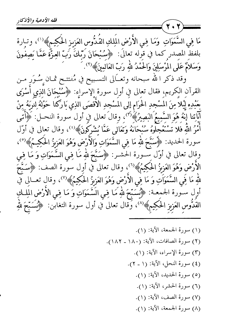 وقد ذكر الله سبحانه وتعالى التسبيح في مُفتتح ثمان سُوَر من القرآن الكريم، فقال تعالى في أول سورة الإسراء: {سُبْحَانَ الَّذِي أَسْرَى بِعَبْدِهِ لَيْلاً مِنَ المَسْجِدِ الحَرَامِ إِلَى المَسْجِدِ الأَقْصَى الَّذِي بَارَكْنَا حَوْلَهُ لِنُرِيَهُ مِنْ آيَاتِنا إِنَّهُ هُوَ السَّمِيعُ البَصِيرُ} 3، وقال تعالى في أول سورة النحل: {أَتَى أَمْرُ اللهِ فَلاَ تَسْتَعْجِلُوهُ سُبْحَانَهُ وَتَعَالَى عَمَّا يُشْرِكُونَ} 4، وقال تعالى في أوّل سورة الحديد: {سَبَّحَ للهِ مَا فِي السَّمَوَاتِ وَالأَرْضِ وَهُوَ العَزِيزُ الحَكِيمُ} 5، وقال تعالى في أوّل سورة الحشر: {سَبَّحَ للهِ مَا فِي السَّمَوَاتِ وَمَا فِي الأَرْضِ وَهُوَ العَزِيزُ الحَكِيمُ} 6، وقال تعالى في أول سورة الصف: {سَبَّحَ للهِ مَا فِي السَّمَوَاتِ وَمَا فِي الأَرْضِ وَهُوَ العَزِيزُ الحَكِيمُ} 7، وقال تعالى في أول سورة الجمعة: {يُسَبِّحَ للهِ