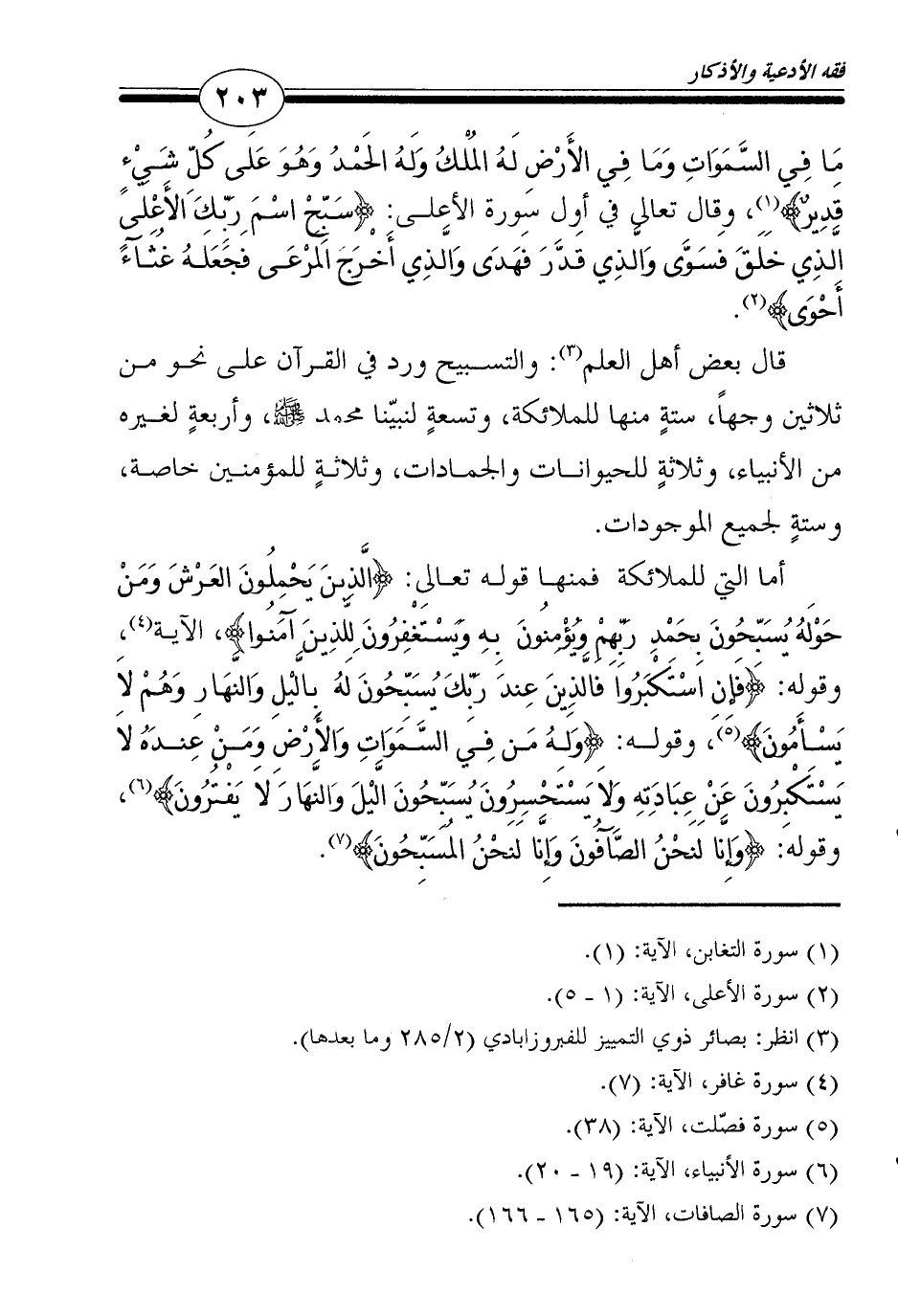 قال بعض أهل العلم4: والتسبيح ورد في القرآن على نحو من ثلاثين وجهاً، ستةٍ منها للملائكة، وتسعةٍ لنبيّنا محمد صلى الله عليه وسلم، وأربعةٍ لغيره من الأنبياء، وثلاثةٍ للحيوانات والجمادات، وثلاثةٍ للمؤمنين خاصة، وستةٍ لجميع الموجودات.