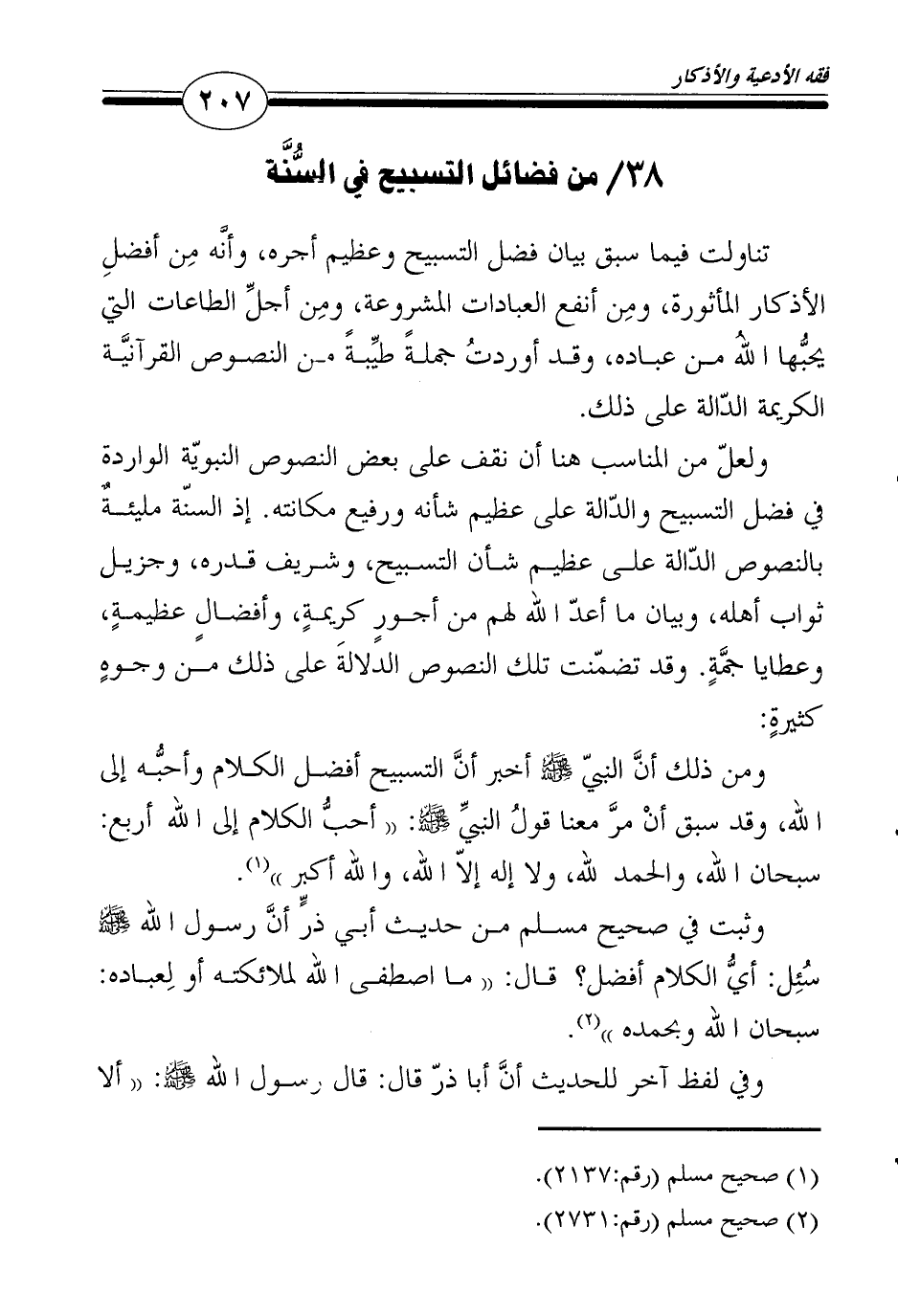 ومن ذلك أنَّ النبيّ صلى الله عليه وسلم أخبر أنَّ التسبيح أفضل الكلام وأحبُّه إلى الله، وقد سبق أنْ مرَّ معنا قولُ النبيِّ صلى الله عليه وسلم: "أحبُّ الكلام إلى الله أربع: سبحان الله، والحمد لله، ولا إله إلاّ الله، والله أكبر"1.