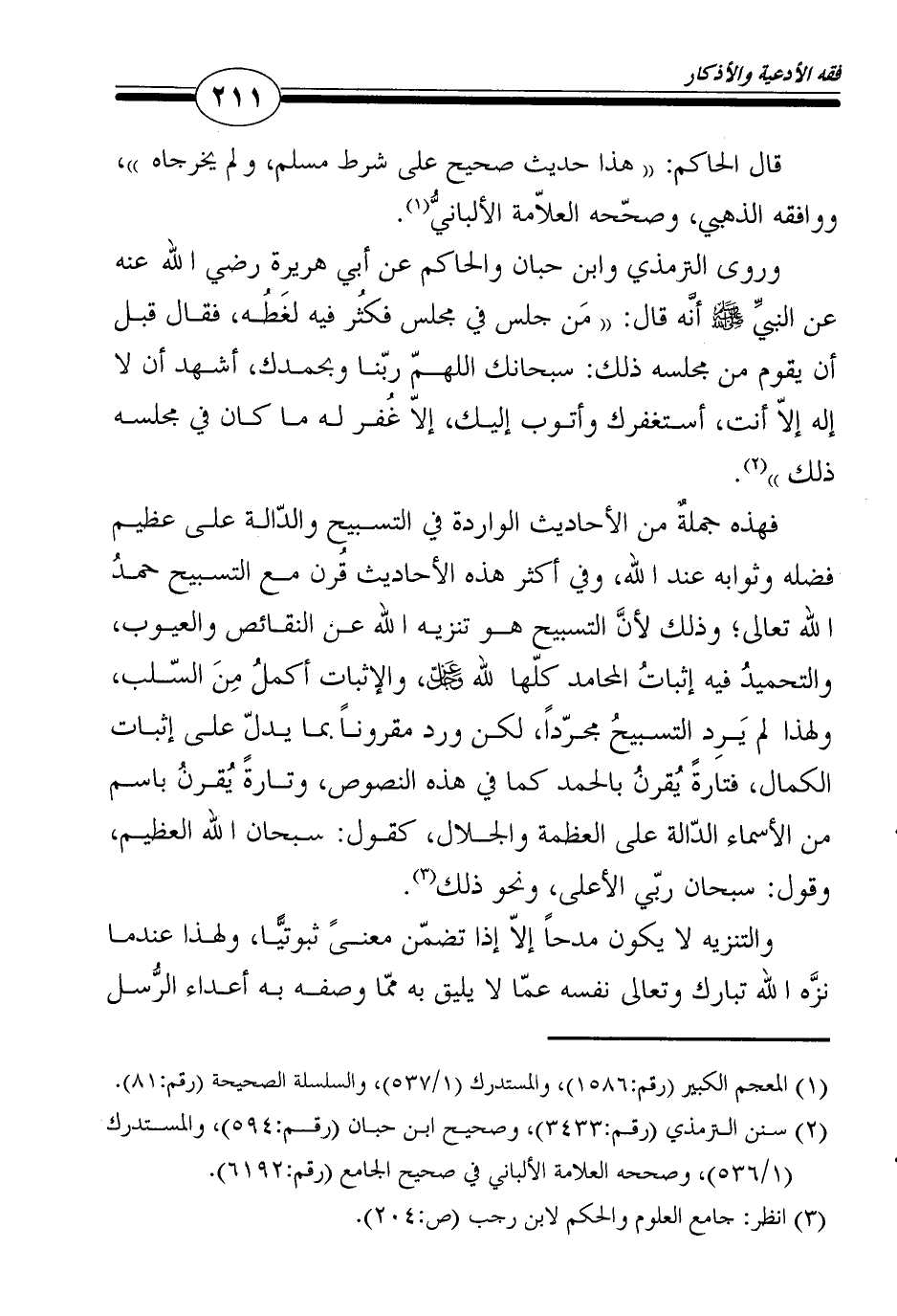 فهذه جملةٌ من الأحاديث الواردة في التسبيح والدّالة على عظيم فضله وثوابه عند الله، وفي أكثر هذه الأحاديث قُرن مع التسبيح حمدُ الله تعالى؛ وذلك لأنَّ التسبيح هو تنزيه الله عن النقائص والعيوب، والتحميدُ فيه إثباتُ المحامد كلّها لله عز وجل، والإثبات أكملُ مِنَ السّلب، ولهذا لم يَرِد التسبيحُ مجرّداً، لكن ورد مقروناً بما يدلّ على إثبات الكمال، فتارةً يُقرنُ بالحمد كما في هذه النصوص، وتارةً يُقرنُ باسم من الأسماء الدّالة على العظمة والجلال، كقول: سبحان الله العظيم، وقول: سبحان ربّي الأعلى، ونحو ذلك3.