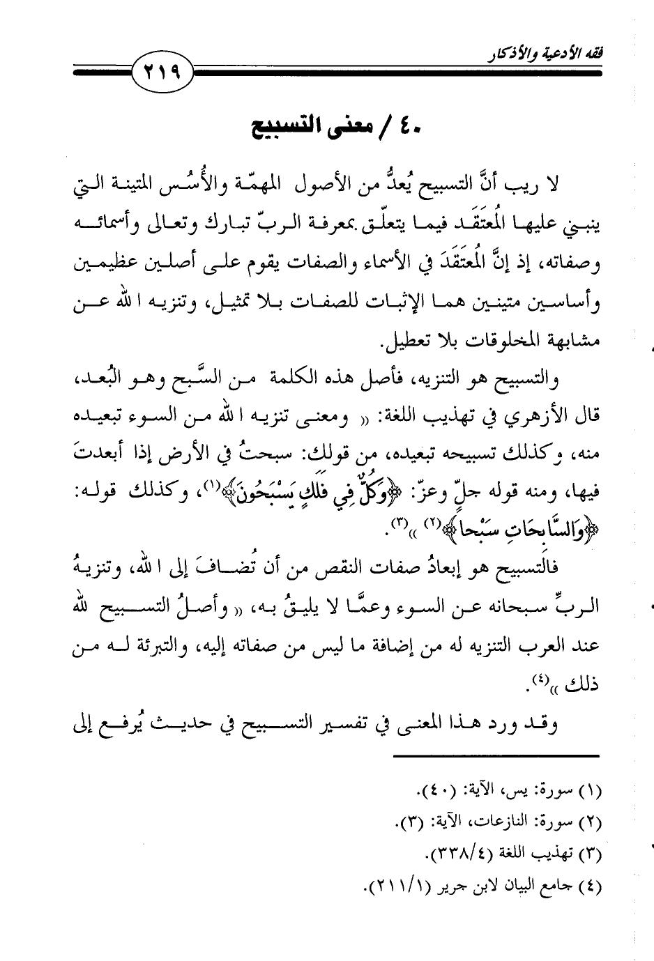 والتسبيح هو التنزيه، فأصل هذه الكلمة من السَّبح وهو البُعد، قال الأزهري في تهذيب اللغة: "ومعنى تنزيه الله من السوء تبعيده منه، وكذلك تسبيحه تبعيده، من قولك: سبحتُ في الأرض إذا أبعدتَ فيها، ومنه قوله جلّ وعزّ: {وَكُلٌّ فِي فَلَكٍ يَسْبَحُونَ} 1، وكذلك قوله: {وَالسَّابِحَاتِ سَبْحاً} 2") 3.