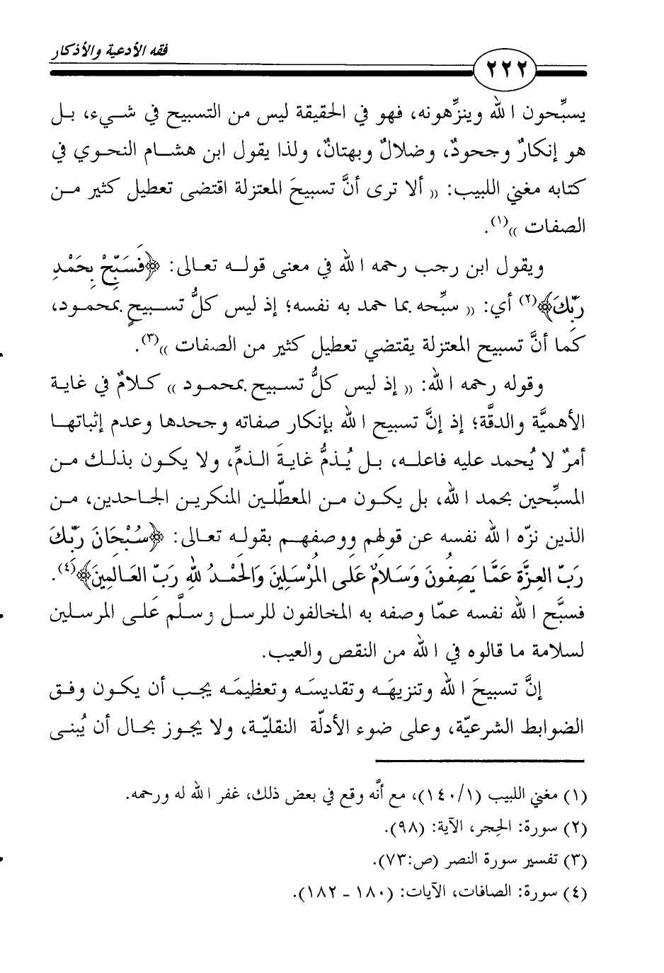 ويقول ابن رجب رحمه الله في معنى قوله تعالى: {فَسَبِّحْ بِحَمْدِ رَبِّكَ} 2 أي: "سبِّحه بما حمد به نفسه؛ إذ ليس كلُّ تسبيحٍ بمحمود، كما أنَّ تسبيح المعتزلة يقتضي تعطيل كثير من الصفات"3.