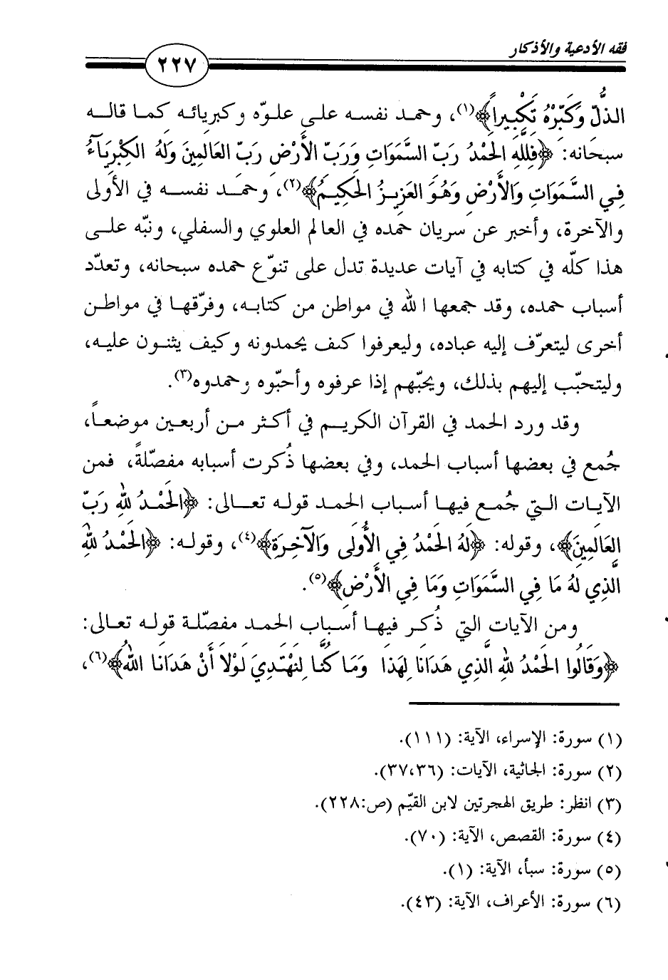 الذُّلِّ وَكَبِّرْهُ تَكْبِيراً} 1، وحمد نفسه على علوّه وكبريائه كما قاله سبحانه: {فَلِلَّهِ الحَمْدُ رَبِّ السَّمَوَاتِ وَرَبِّ الأَرْضِ رَبِّ العَالَمِينَ وَلَهُ الكِبْرِيَآءُ فِي السَّمَوَاتِ وَالأَرْضِ وَهُوَ العَزِيزُ الحَكِيمُ} 2، وحمد نفسه في الأولى والآخرة، وأخبر عن سريان حمده في العالم العلوي والسفلي، ونبّه على هذا كلّه في كتابه في آيات عديدة تدل على تنوّع حمده سبحانه، وتعدّد أسباب حمده، وقد جمعها الله في مواطن من كتابه، وفرّقها في مواطن أخرى ليتعرّف إليه عباده، وليعرفوا كيف يحمدونه وكيف يثنون عليه، وليتحبّب إليهم بذلك، ويحبّهم إذا عرفوه وأحبّوه وحمدوه3.