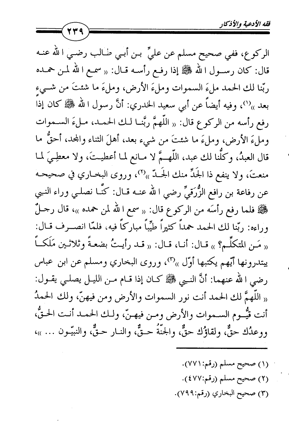 الركوع، ففي صحيح مسلم عن عليِّ بن أبي طالب رضي الله عنه قال: كان رسول الله صلى الله عليه وسلم إذا رفع رأسه قال: "سمع الله لمن حمده ربّنا لك الحمد ملءَ السموات وملءَ الأرض، وملءَ ما شئتَ من شيءٍ بعد "1، وفيه أيضاً عن أبي سعيد الخدري: أنَّ رسول الله صلى الله عليه وسلم كان إذا رفع رأسه من الركوع قال: "اللهمَّ ربَّنا لك الحمد، ملءَ السموات وملءَ الأرض، وملءَ ما شئتَ من شيء بعد، أهلَ الثناء والمجد، أحقُّ ما قال العبدُ، وكلُّنا لك عبد، اللهمَّ لا مانع لما أعطيتَ، ولا معطِيَ لما منعتَ، ولا ينفع ذا الجَدِّ منك الجَدّ"2، وروى البخاري في صحيحه عن رفاعة بن رافع الزُّرَقيِّ رضي الله عنه قال: كنَّا نصلي وراء النبي صلى الله عليه وسلم فلما رفع رأسَه من الركوع قال: "سمع الله لمن حمده"، قال رجلٌ وراءه: ربّنا لك الحمد حمداً كثيراً طيِّباً مباركاً فيه، فلمّا انصرف قال: "مَن المتكلِّم؟ " قال: أنا، قال: "قد رأيتُ بضعةً وثلاثين مَلَكاً يبتدرونها أيّهم يكتبها أوّل "3، وروى البخاري ومسلم عن ابن عباس رضي الله عنهما: أنَّ النبي صلى الله عليه وسلم كان إذا قام من الليل يصلي يقول: "اللهمَّ لك الحمد أنت نور السموات والأرض ومن فيهنّ، ولك الحمدُ أنت قيُّوم السموات والأرض ومن فيهنّ، ولك الحمد أنت الحقُّ، ووعدُك حقٌّ، ولقاؤُك حقٌّ، والجنّةُ حقٌّ، والنار حقٌّ، والنبيّون ... "،