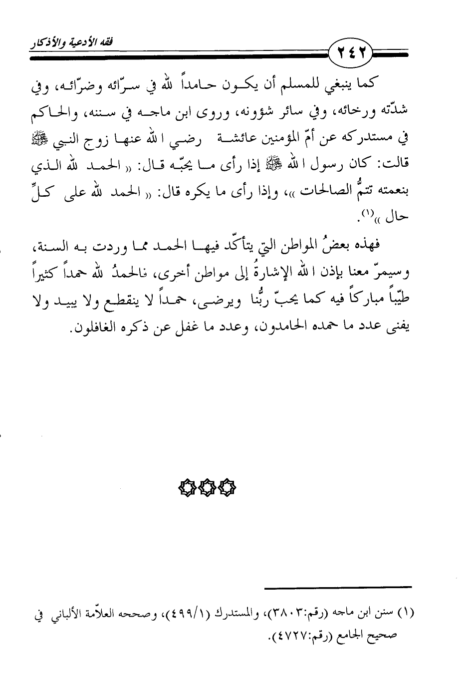 كما ينبغي للمسلم أن يكون حامداً لله في سرّائه وضرّائه، وفي شدّته ورخائه، وفي سائر شؤونه، وروى ابن ماجه في سننه، والحاكم في مستدركه عن أمّ المؤمنين عائشة رضي الله عنها زوج النبي صلى الله عليه وسلم قالت: كان رسول الله صلى الله عليه وسلم إذا رأى ما يحبّه قال: "الحمد لله الذي بنعمته تتمُّ الصالحات"، وإذا رأى ما يكره قال: "الحمد لله على كلِّ حال"1.