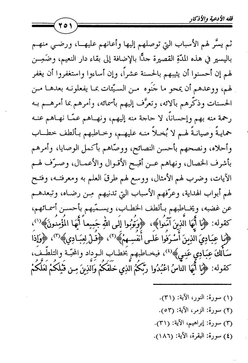 ثم يسَّر لهم الأسباب التي توصلهم إليها وأعانهم عليها، ورضي منهم باليسير في هذه المدّةِ القصيرة جدًّا بالإضافة إلى بقاء دار النعيم، وضَمِن لهم إن أحسنوا أن يثيبهم بالحسنة عشراً، وإن أساءوا واستغفروا أن يغفر لهم، ووعدهم أن يمحو ما جَنَوه من السيّئات بما يفعلونه بعدها من الحسنات وذكّرهم بآلائه، وتعرَّف إليهم بأسمائه، وأمرهم بما أمرهم به رحمة منه بهم وإحساناً، لا حاجة منه إليهم، ونهاهم عمّا نهاهم عنه حمايةً وصيانةً لهم لا بُخلاً منه عليهم، وخاطبهم بألطف خطاب وأحلاه، ونصحهم بأحسن النصائح، ووصّاهم بأكمل الوصايا، وأمرهم بأشرف الخصال، ونهاهم عن أقبح الأقوال والأعمال، وصرّف لهم الآيات، وضرب لهم الأمثال، ووسع لهم طرقَ العلم به ومعرفته، وفتح لهم أبواب الهداية، وعرّفهم الأسباب التي تدنيهم مِن رضاه، وتبعدهم عن غضبه، ويخاطبهم بألطف الخطاب، ويسمّيهم بأحسن أسمائهم، كقوله: {يَا أَيُّهَا الَّذِينَ آمَنُوا} ، {وَتُوبُوا إِلَى اللهِ جَمِيعاً أَيُّهَا المُؤْمِنُونَ} 1، {يَا عِبَادِيَ الَّذِينَ أَسْرَفُوا عَلَى أَنفُسِهِمْ} 2، {قُلْ لِعِبَادِي} 3، {وَإِذَا سَأَلَكَ عِبَادِي عَنِي} 4، فيخاطبهم بخطاب الوِداد والمحبّة والتلطّف، كقوله: {يَا أَيُّهَا النَّاسُ اعْبُدُوا رَبَّكُمُ الَّذِي خَلَقَكُمْ وَالَّذِينَ مِن قَبْلِكُمْ لَعَلَّكُمْ