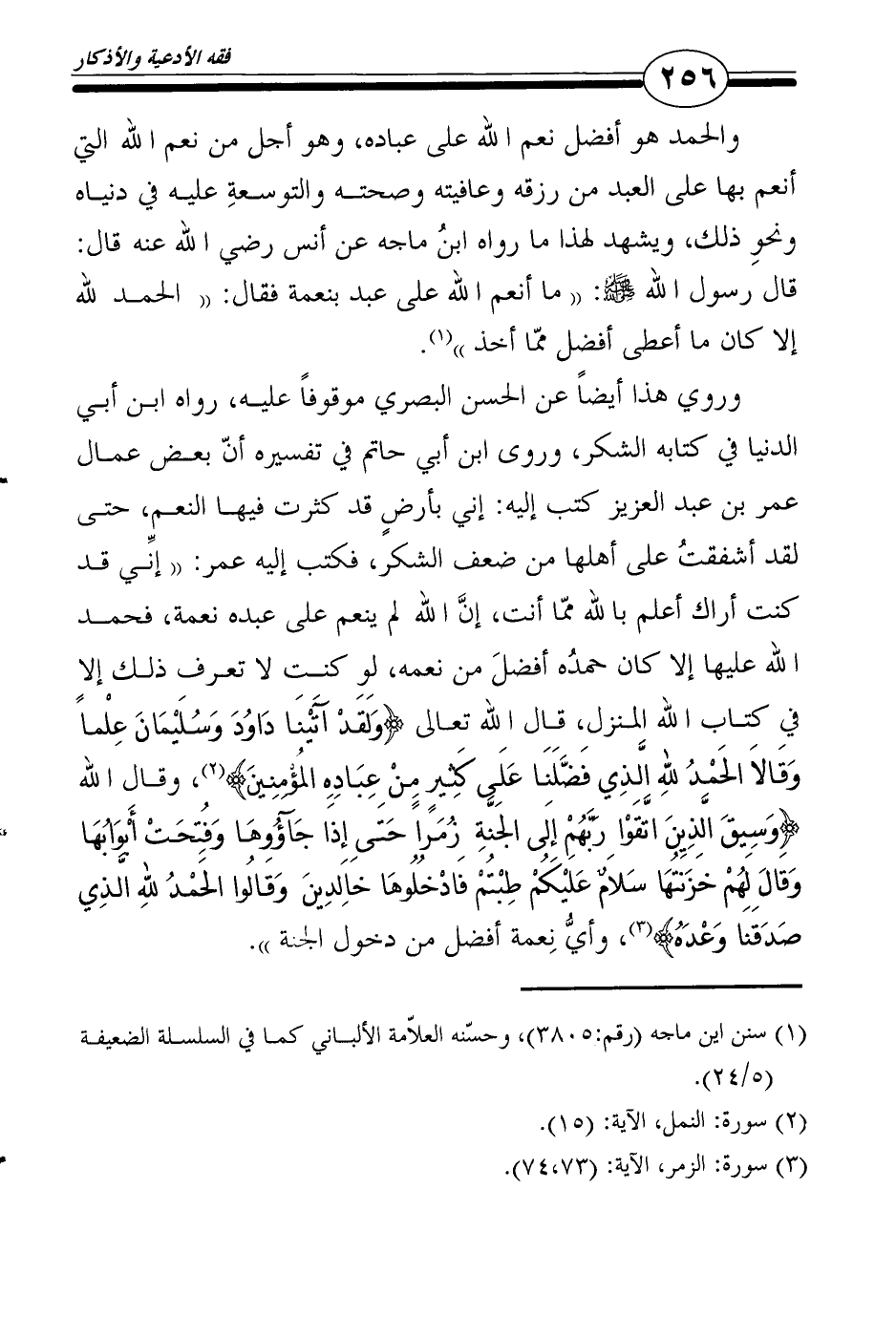 وروي هذا أيضاً عن الحسن البصري موقوفاً عليه، رواه ابن أبي الدنيا في كتابه الشكر، وروى ابن أبي حاتم في تفسيره أنّ بعض عمال عمر بن عبد العزيز كتب إليه: إني بأرضٍ قد كثرت فيها النعم، حتى لقد أشفقتُ على أهلها من ضعف الشكر، فكتب إليه عمر: "إنِّي قد كنت أراك أعلم بالله ممّا أنت، إنَّ الله لم ينعم على عبده نعمة، فحمد الله عليها إلا كان حمدُه أفضلَ من نعمه، لو كنت لا تعرف ذلك إلا في كتاب الله المنزل، قال الله تعالى {وَلَقَدْ آتَيْنَا دَاوُدَ وَسُلَيْمَانَ عِلْماً وَقَالاَ الحَمْدُ للهِ الَّذِي فَضَّلَنَا عَلَى كَثِيرٍ مِنْ عِبَادِهِ المُؤْمِنِينَ} 2، وقال الله {وَسِيقَ الَّذِينَ اتَّقَوْا رَبَّهُمْ إِلَى الجَنَّةِ زُمَراً حَتَى إِذَا جَآؤُوهَا وَفُتِحَتْ أَبْوَابُهَا وَقَالَ لَهُمْ خَزَنَتُهَا سَلاَمٌ عَلَيْكُمْ طِبْتُمْ فَادْخُلُوهَا خَالِدِينَ وَقَالُوا الحَمْدُ للهِ الَّذِي صَدَقَنَا وَعْدَهُ} 3، وأيُّ نِعمة أفضل من دخول الجنة".