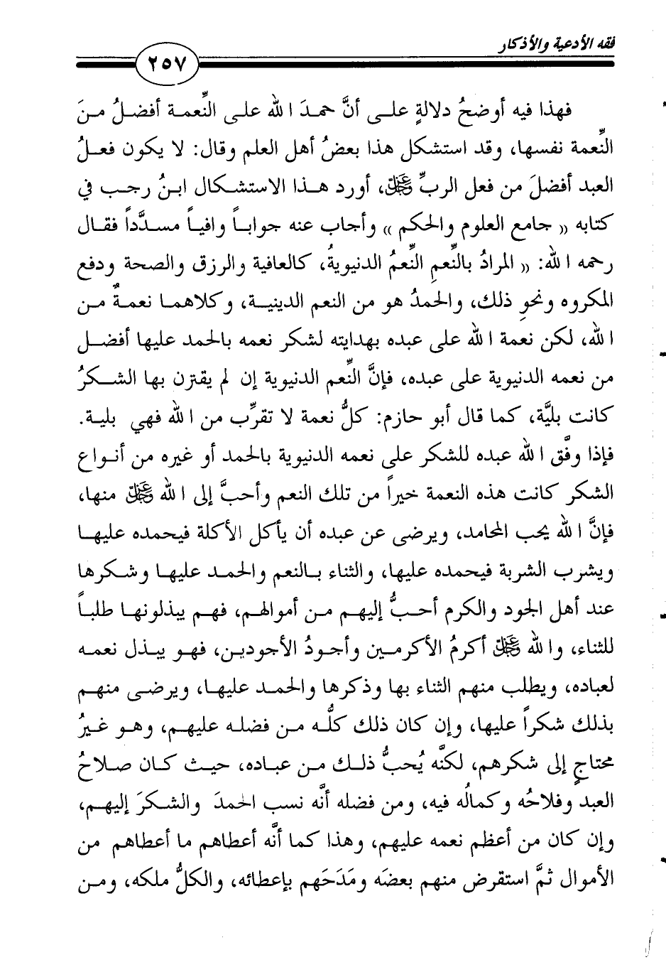 فهذا فيه أوضحُ دلالةٍ على أنَّ حمدَ الله على النِّعمة أفضلُ منَ النِّعمة نفسها، وقد استشكل هذا بعضُ أهل العلم وقال: لا يكون فعلُ العبد أفضلَ من فعل الربِّ عز وجل، أورد هذا الاستشكال ابنُ رجب في كتابه "جامع العلوم والحكم" وأجاب عنه جواباً وافياً مسدَّداً فقال رحمه الله: "المرادُ بالنِّعمِ النِّعمُ الدنيويةُ، كالعافية والرزق والصحة ودفع المكروه ونحوِ ذلك، والحمدُ هو من النعم الدينية، وكلاهما نعمةٌ من الله، لكن نعمة الله على عبده بهدايته لشكر نعمه بالحمد عليها أفضل من نعمه الدنيوية على عبده، فإنَّ النِّعم الدنيوية إن لم يقترن بها الشكرُ كانت بليَّة، كما قال أبو حازم: كلُّ نعمة لا تقرِّب من الله فهي بلية. فإذا وفَّق الله عبده للشكر على نعمه الدنيوية بالحمد أو غيره من أنواع الشكر كانت هذه النعمة خيراً من تلك النعم وأحبَّ إلى الله عز وجل منها، فإنَّ الله يحب المحامد، ويرضى عن عبده أن يأكل الأكلة فيحمده عليها ويشرب الشربة فيحمده عليها، والثناء بالنعم والحمد عليها وشكرها عند أهل الجود والكرم أحبُّ إليهم من أموالهم، فهم يبذلونها طلباً للثناء، والله عز وجل أكرمُ الأكرمين وأجودُ الأجودين، فهو يبذل نعمه لعباده، ويطلب منهم الثناء بها وذكرها والحمد عليها، ويرضى منهم بذلك شكراً عليها، وإن كان ذلك كلُّه من فضله عليهم، وهو غيرُ محتاجٍ إلى شكرهم، لكنَّه يُحبُّ ذلك من عباده، حيث كان صلاحُ العبد وفلاحُه وكمالُه فيه، ومن فضله أنَّه نسب الحمدَ والشكرَ إليهم، وإن كان من أعظم نعمه عليهم، وهذا كما أنَّه أعطاهم ما أعطاهم من الأموال ثمَّ استقرض منهم بعضَه ومَدَحَهم بإعطائه، والكلُّ ملكه، ومن