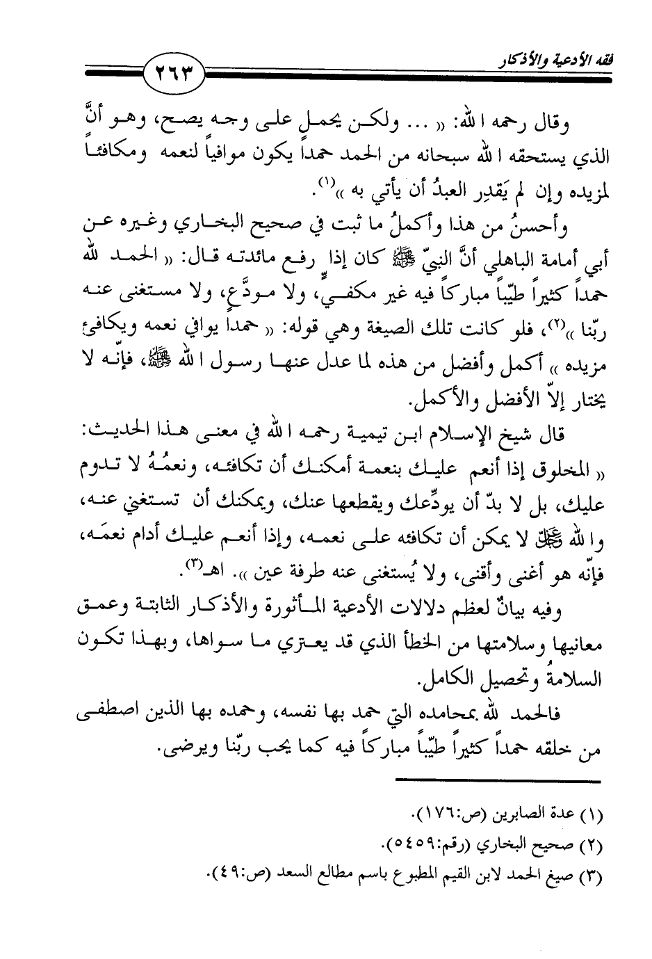 وأحسنُ من هذا وأكملُ ما ثبت في صحيح البخاري وغيره عن أبي أمامة الباهلي أنَّ النبيّ صلى الله عليه وسلم كان إذا رفع مائدته قال: "الحمد لله حمداً كثيراً طيّباً مباركاً فيه غير مكفيٍّ، ولا مودَّع، ولا مستغنى عنه ربّنا"2، فلو كانت تلك الصيغة وهي قوله: "حمداً يوافي نعمه ويكافئ مزيده" أكمل وأفضل من هذه لما عدل عنها رسول الله صلى الله عليه وسلم، فإنّه لا يختار إلاّ الأفضل والأكمل.