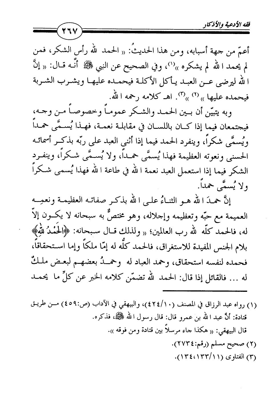 أعمّ من جهة أسبابه، ومن هذا الحديثُ: "الحمد لله رأس الشكر، فمن لم يحمد الله لم يشكره"1، وفي الصحيح عن النبي صلى الله عليه وسلم أنَّه قال: "إنَّ الله ليرضى عن العبد يأكل الأكلة فيحمده عليها ويشرب الشربة فيحمده عليها" 2") 3. اهـ كلامه رحمه الله.