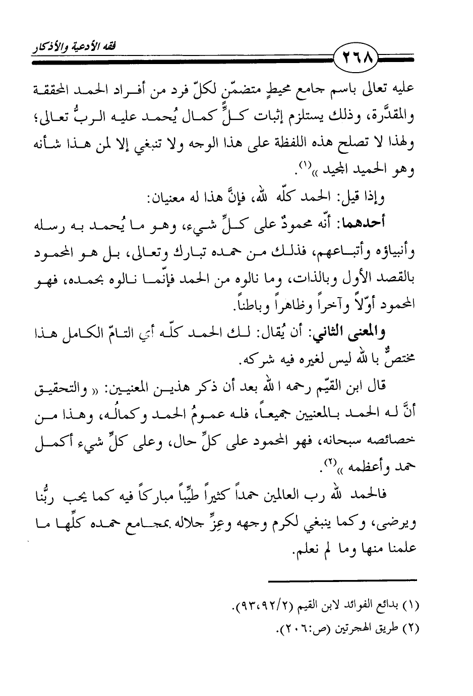 قال ابن القيّم رحمه الله بعد أن ذكر هذين المعنيين: "والتحقيق أنَّ له الحمد بالمعنيين جميعاً، فله عمومُ الحمد وكمالُه، وهذا من خصائصه سبحانه، فهو المحمود على كلِّ حال، وعلى كلِّ شيء أكمل حمد وأعظمه"2.