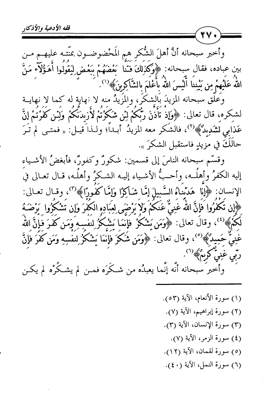 وقسّم سبحانه الناسَ إلى قسمين: شكورٌ وكفورٌ، فأبغضُ الأشياءِ إليه الكفرُ وأهلُه، وأحبُّ الأشياء إليه الشكرُ وأهلُه، قال تعالى في الإنسان: {إِنَّا هَدَيْنَاهُ السَّبِيلَ إِمَّا شَاكِرًا وَإِمَّا كَفُورًا} 3، وقال تعالى: {إِن تَكْفُرُوا فَإِنَّ اللهَ غَنِيٌّ عَنكُمْ وَلاَ يَرْضَى لِعِبَادِهِ الكُفْرَ وَإِن تَشْكُرُوا يَرْضَهُ لَكُمْ} 4، وقال تعالى: {وَمَن يَشْكُرْ فَإِنَّمَا يَشْكُرُ لِنَفْسِهِ وَمَن كَفَرَ فَإِنَّ اللهَ غَنِيٌّ حَمِيدٌ} 5، وقال تعالى: {وَمَن شَكَرَ فَإِنَّمَا يَشْكُرُ لِنَفْسِهِ وَمَن كَفَرَ فَإِنَّ رَبِّي غَنِيٌّ كَرِيمٌ} 6.