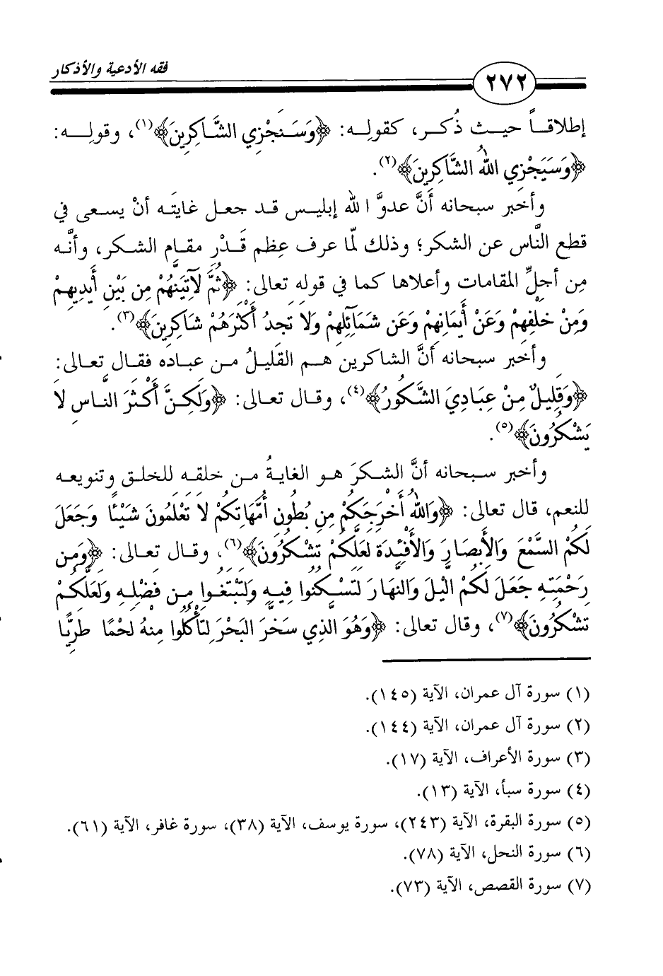 وأخبر سبحانه أنَّ الشاكرين هم القليلُ من عباده فقال تعالى: {وَقَلِيلٌ مِنْ عِبَادِيَ الشَّكُورُ} 4، وقال تعالى: {وَلَكِنَّ أَكْثَرَ النَّاسِ لاَ يَشْكُرُونَ} 5.