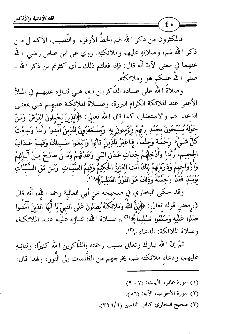 وصلاةُ الله على عباده الذّاكرين له، هي ثناؤه عليهم في الملأ الأعلى عند الملائكة الكرام البررة، وصلاةُ الملائكة عليهم هي بمعنى الدعاء لهم والاستغفار، كما قال الله تعالى: {الَّذِينَ يَحْمِلُونَ العَرْشَ وَمَنْ حَوْلَهُ يُسَبِّحُونَ بِحَمْدِ رَبِّهِمْ وَيُؤْمِنُونَ بِهِ وَيَسْتَغْفِرُونَ لِلَّذِينَ آمَنُوا رَبَّنَا وَسِعْتَ كَلَّ شَيْءٍ رَحْمَةً وَعِلْماً، فَاغْفِرْ لِلَّذِينَ تَابُوا وَاتَّبَعُوا سَبِيلَكَ وَقِهِمْ عَذَابَ الجَحِيمِ، رَبَّنَا وَأَدْخِلْهُمْ جَنَّاتِ عَدْنٍ الَّتِي وَعَدْتَهُمْ وَمَن صَلَحَ مِنْ آبَائِهِمْ وَأَزْوَاجِهِمْ وَذُرِّيَاتِهِمْ إِنَّكَ أَنتَ العَزِيزُ الحَكِيمُ وَقِهِمُ السَّيِّئَاتِ وَمَن تَقِ السَّيِّئَاتِ يَوْمَئِذٍ فَقَدْ رَحِمْتَهُ وَذَلِكَ هُوَ الفَوْزُ العَظِيمُ} 1.