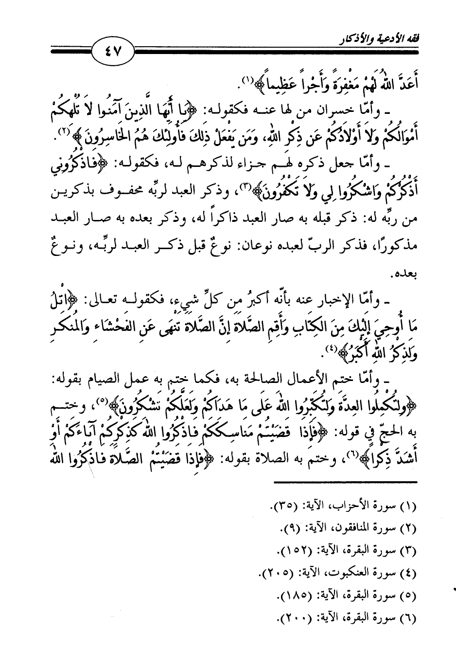 ـ وأمّا ختم الأعمال الصالحة به، فكما ختم به عمل الصيام بقوله: {ولِتُكْمِلُوا العِدَّةَ وَلِتُكَبِّرُوا اللهَ عَلَى مَا هَدَاكُمْ وَلَعَلَّكُمْ تَشْكُرُونَ} 5، وختم به الحجّ في قوله: {فَإِذَا قَضَيْتُمْ مَنَاسِكَكَمْ فَاذْكُرُوا اللهَ كَذِكْرِكُمْ آبَاءَكَمْ أَوْ أَشَدَّ ذِكْراً} 6، وختم به الصلاة بقوله: {فَإِذَا قَضَيْتُمْ الصَّلاَةَ فَاذْكُرُوا اللهَ