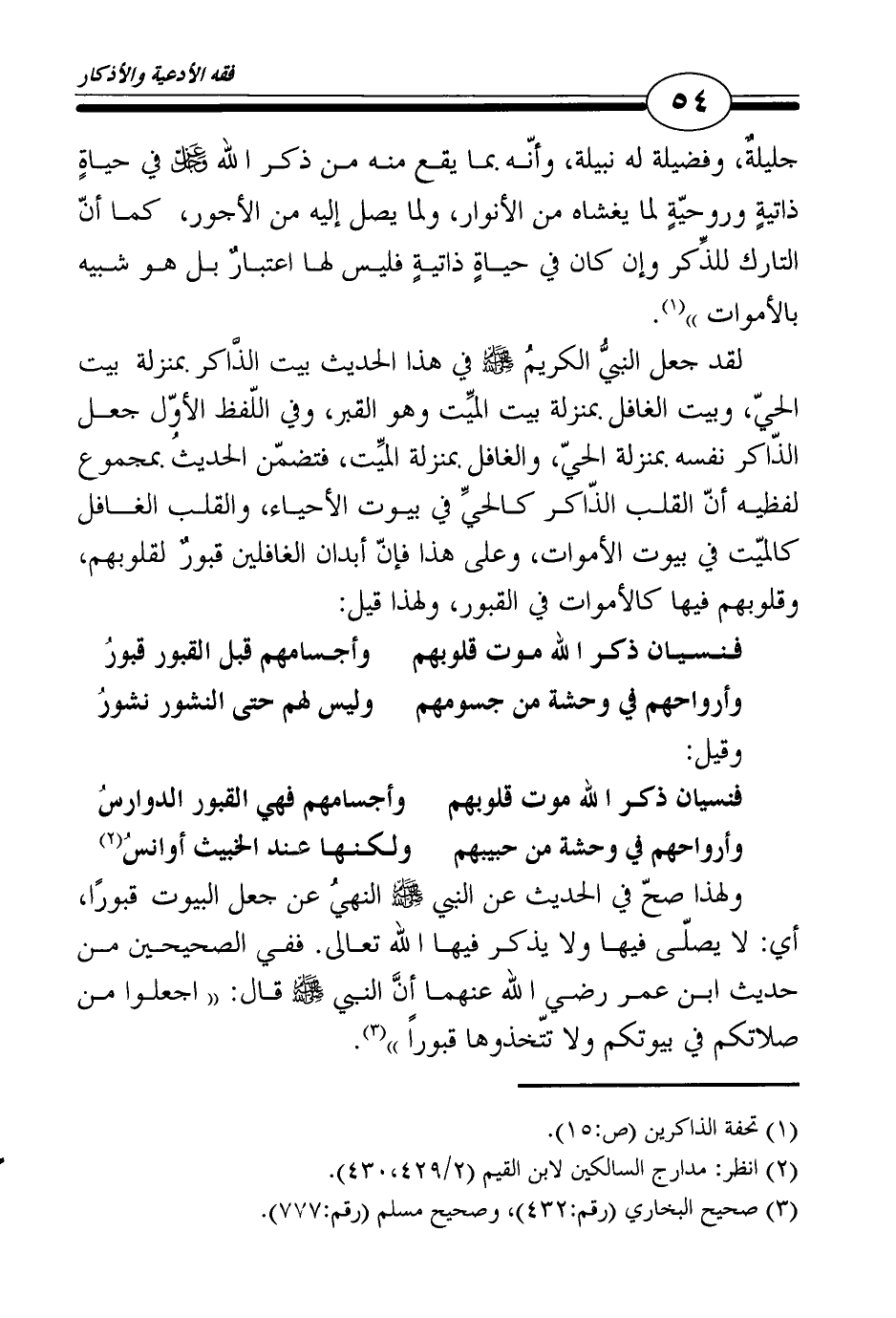 ولهذا صحّ في الحديث عن النبي صلى الله عليه وسلم النهيُ عن جعل البيوت قبورًا، أي: لا يصلّى فيها ولا يذكر فيها الله تعالى. ففي الصحيحين من حديث ابن عمر رضي الله عنهما أنَّ النبي صلى الله عليه وسلم قال: "اجعلوا من صلاتكم في بيوتكم ولا تتّخذوها قبوراً"3.