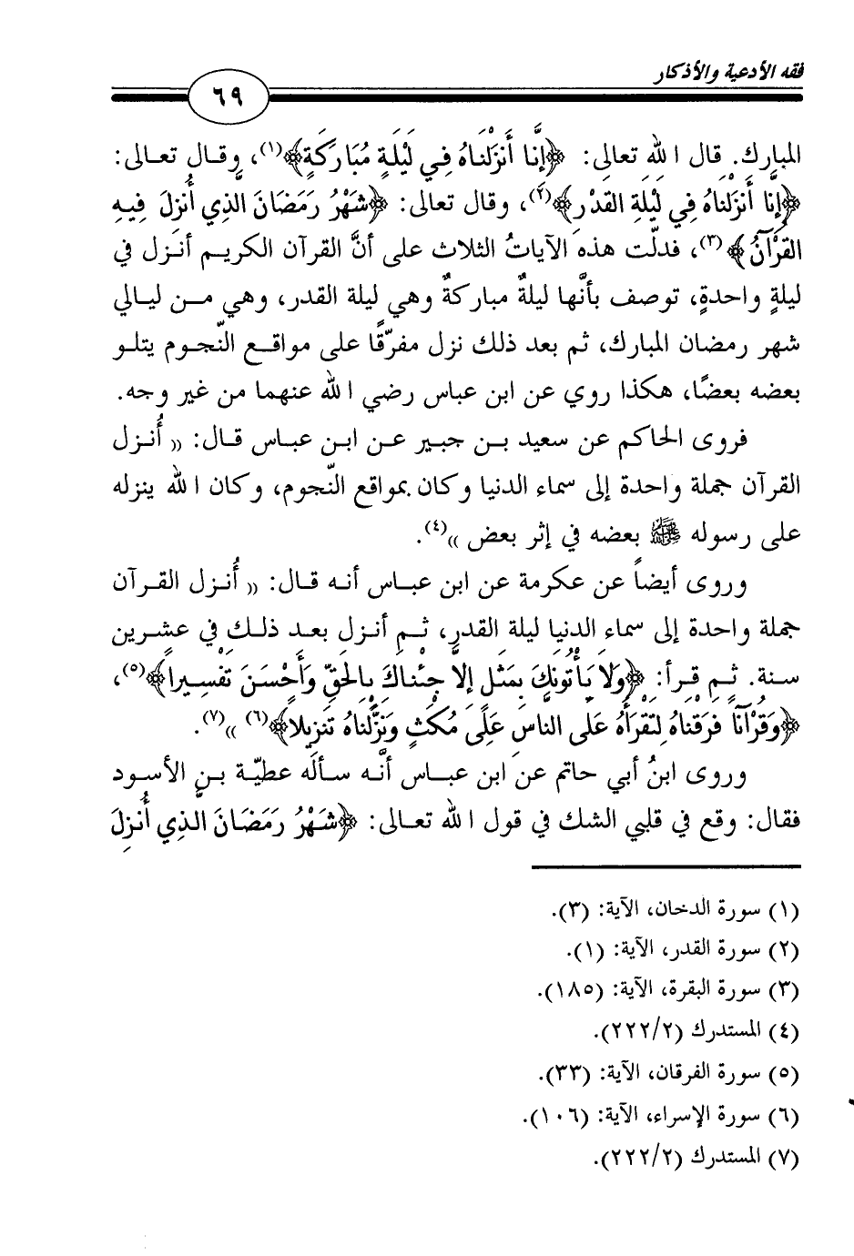 المبارك. قال الله تعالى: {إِنَّا أَنزَلْنَاهُ فِي لَيْلَةٍ مُبَارَكَةٍ} 1، وقال تعالى: {إِنَّا أَنزَلْنَاهُ فِي لَيْلَةِ القَدْرِ} 2، وقال تعالى: {شَهْرُ رَمَضَانَ الَّذِي أُنزِلَ فِيهِ القُرْآنُ} 3، فدلّت هذه الآياتُ الثلاث على أنَّ القرآن الكريم أنزل في ليلةٍ واحدةٍ، توصف بأنَّها ليلةٌ مباركةٌ وهي ليلة القدر، وهي من ليالي شهر رمضان المبارك، ثم بعد ذلك نزل مفرّقًا على مواقع النّجوم يتلو بعضه بعضًا، هكذا روي عن ابن عباس رضي الله عنهما من غير وجه.
