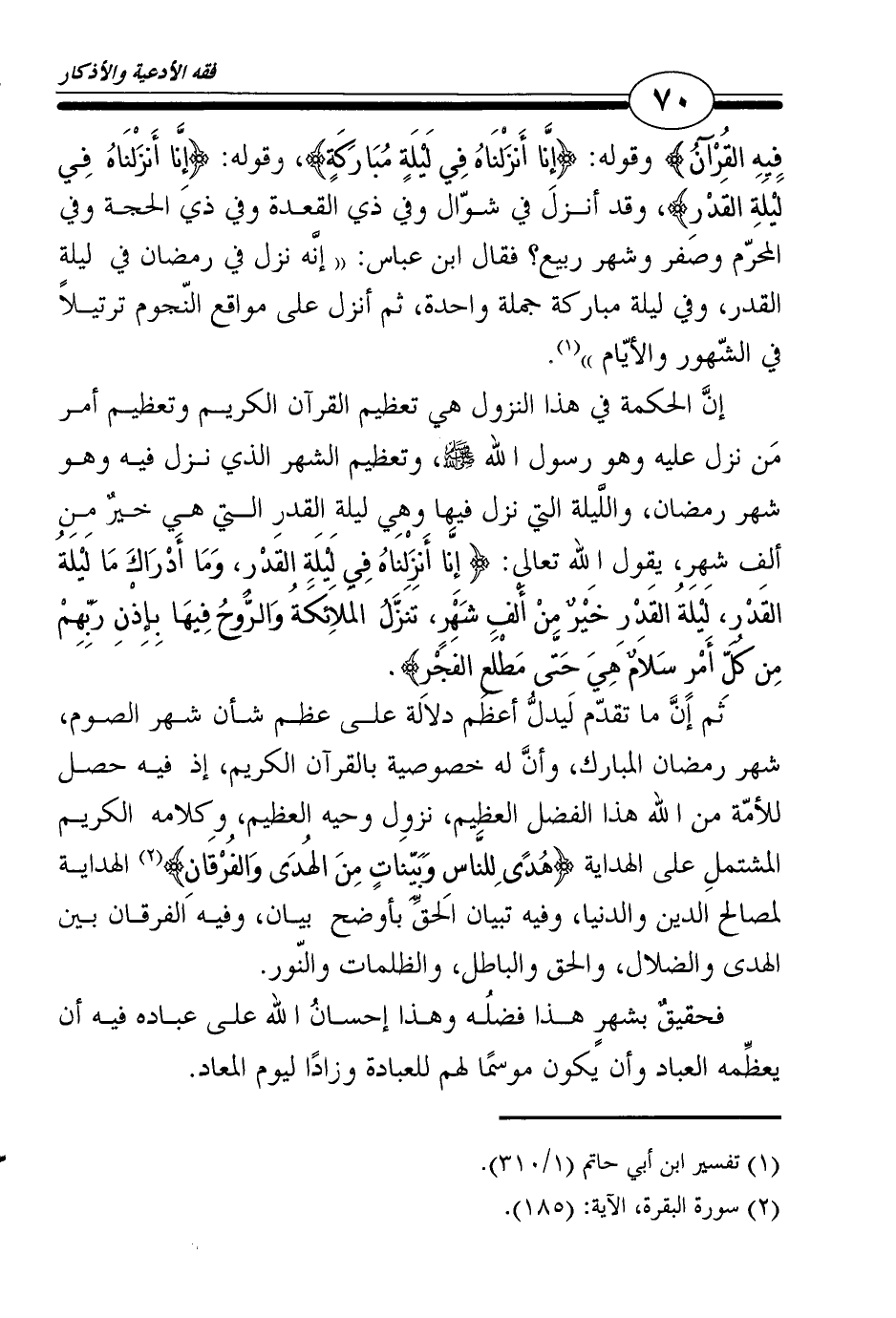 ثم إنَّ ما تقدّم لَيدلُّ أعظم دلالة على عظم شأن شهر الصوم، شهر رمضان المبارك، وأنَّ له خصوصية بالقرآن الكريم، إذ فيه حصل للأمّة من الله هذا الفضل العظيم، نزول وحيه العظيم، وكلامه الكريم المشتملِ على الهداية {هُدًى لِلنَّاسِ وَبَيِّنَاتٍ مِنَ الهُدَى وَالفُرْقَانِ} 2 الهداية لمصالح الدين والدنيا، وفيه تبيان الحقِّ بأوضح بيان، وفيه الفرقان بين الهدى والضلال، والحق والباطل، والظلمات والنّور.
